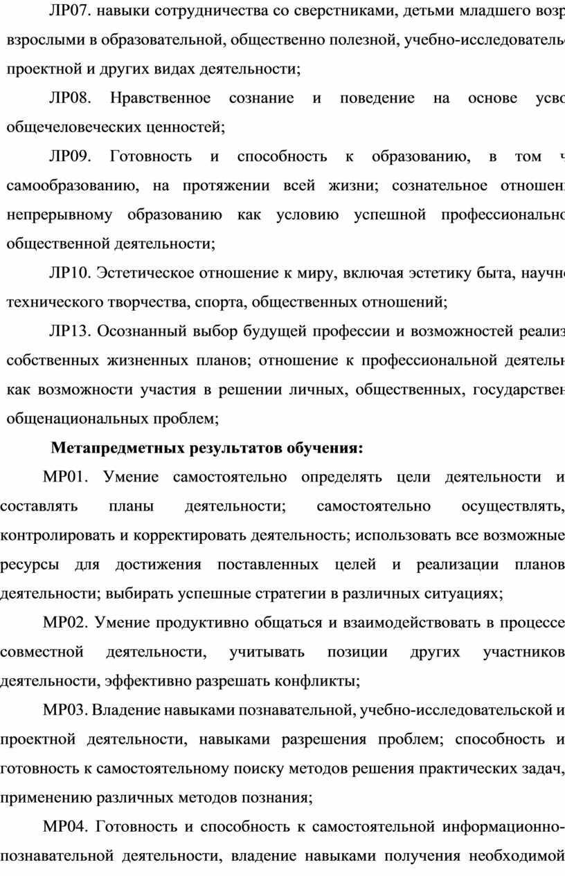 ЛР07. навыки сотрудничества со сверстниками, детьми младшего возраста, взрослыми в образовательной, общественно полезной, учебно-исследовательской, проектной и других видах деятельности; ЛР08. Нравственное сознание и поведение на основе усвоения общечеловеческих ценностей; ЛР09. Готовность и способность к образованию, в том числе самообразованию, на протяжении всей жизни; сознательное отношение к непрерывному образованию как условию успешной профессиональной и общественной деятельности; |