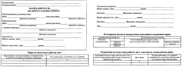 Вопрос№3.Расскажите об организационныхмероприятиях по обеспечению электробезопасности. Дайте определение понятию «Наряд-допуск» Ответ: 1. Освидетельствование, обучение, инструктаж, проверка знаний правил безопасности и инструкций; 2. Допуски к проведению работ с электроустановками с оформлением наряда-допуска, распоряжения или перечня работ в порядке текущей эксплуатации; 3. Проведение работ под контролем ответственного лица. Наряд - это задание на производство работы, оформленное на специальном бланке установленной формы и определяющее содержание, место работы, время ее начала и окончания, условия безопасного проведения, состав бригады и лиц, ответственных за безопасность выполнения работы, и пр. Наряд выписывается в двух, а при передаче его по телефону, радио - в трех экземплярах. Выдать рассматриваемый тип разрешения на выполнение работ требуется по законодательству РФ на срок не более 15-ти календарных дней с момента начала. Допускается возможность продлить - продление допустимо всего 1 раз на аналогичный период (меньше можно, больше нет). В случае перерыва в работах (связанных между собой) наряд аннулируется и считается недействительным. Наряды, работы по которым полностью закончены, должны храниться в течение 30 суток, после чего они могут быть уничтожены.По наряду могут производиться работы в электроустановках, выполняемые: 1. Со снятием напряжения; 2. Без снятия напряжения на токоведущих частях и вблизи них.