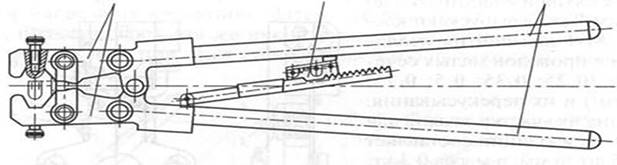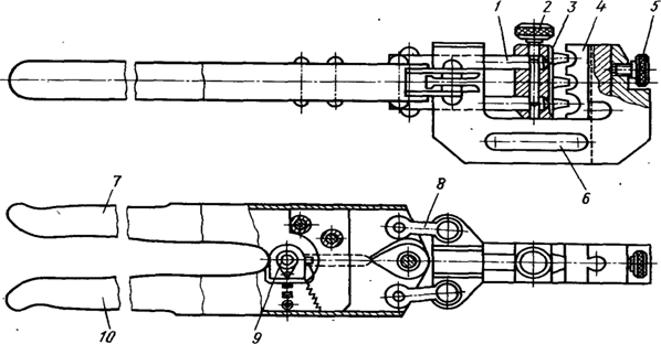 Конструкция клещей МБ-2 1и3-ручки; 2-пружина; 4 и 5 -губки, 6-неподвижный 7-подвижный ножи: 8-прижим