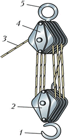 Оба блока соединяются между собой канатом, который, последовательно огибая все ролики блоков, одним концом крепится к верхнему неподвижному блоку, а другой его конец через отводные блоки идет к барабану лебедки. Ролик неподвижного блока, с которого сбегает конец каната, считается отводным. Нижний блок полиспаста, как правило, имеет грузовой крюк, к которому подвешивают поднимаемый груз. Чем больше роликов в полиспасте, тем большее число ветвей каната поддерживают груз и, следовательно, тем меньшая нагрузка приходится на каждую ветвь каната и на лебедку. Число ветвей полиспаста, на которые распределяется масса поднимаемого груза, называют кратностью полиспаста. Конструкция полиспаста: 1-крюк; 2-подвижныйблок;3-канат; 4-неподвижный блок; 5-кольцо подвеса . |