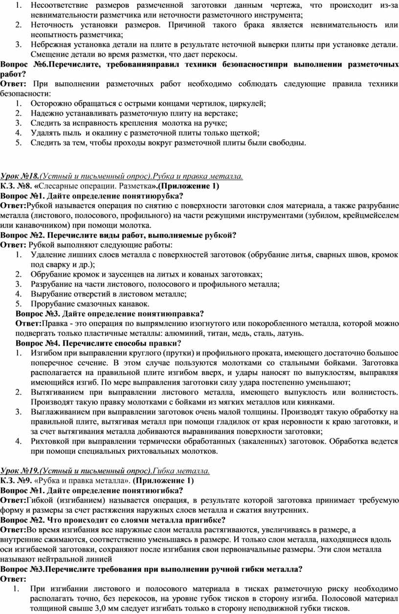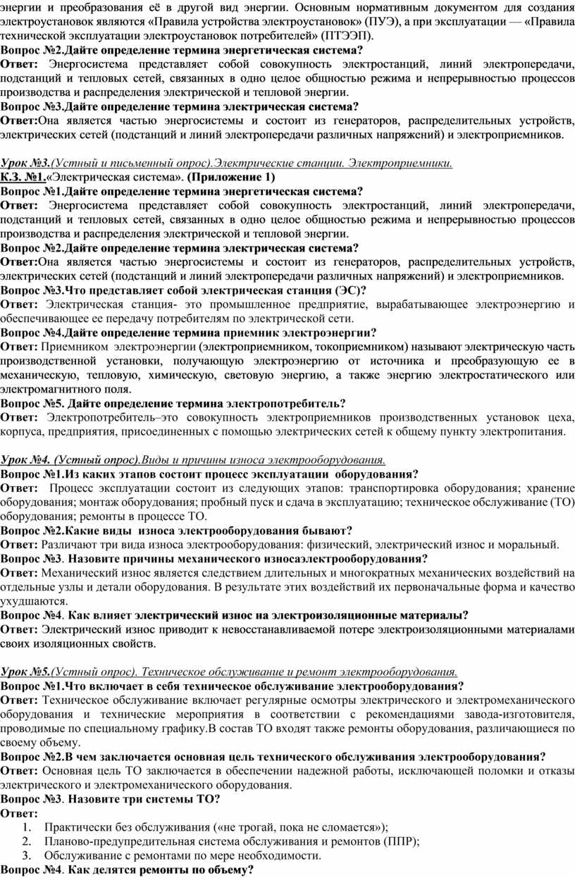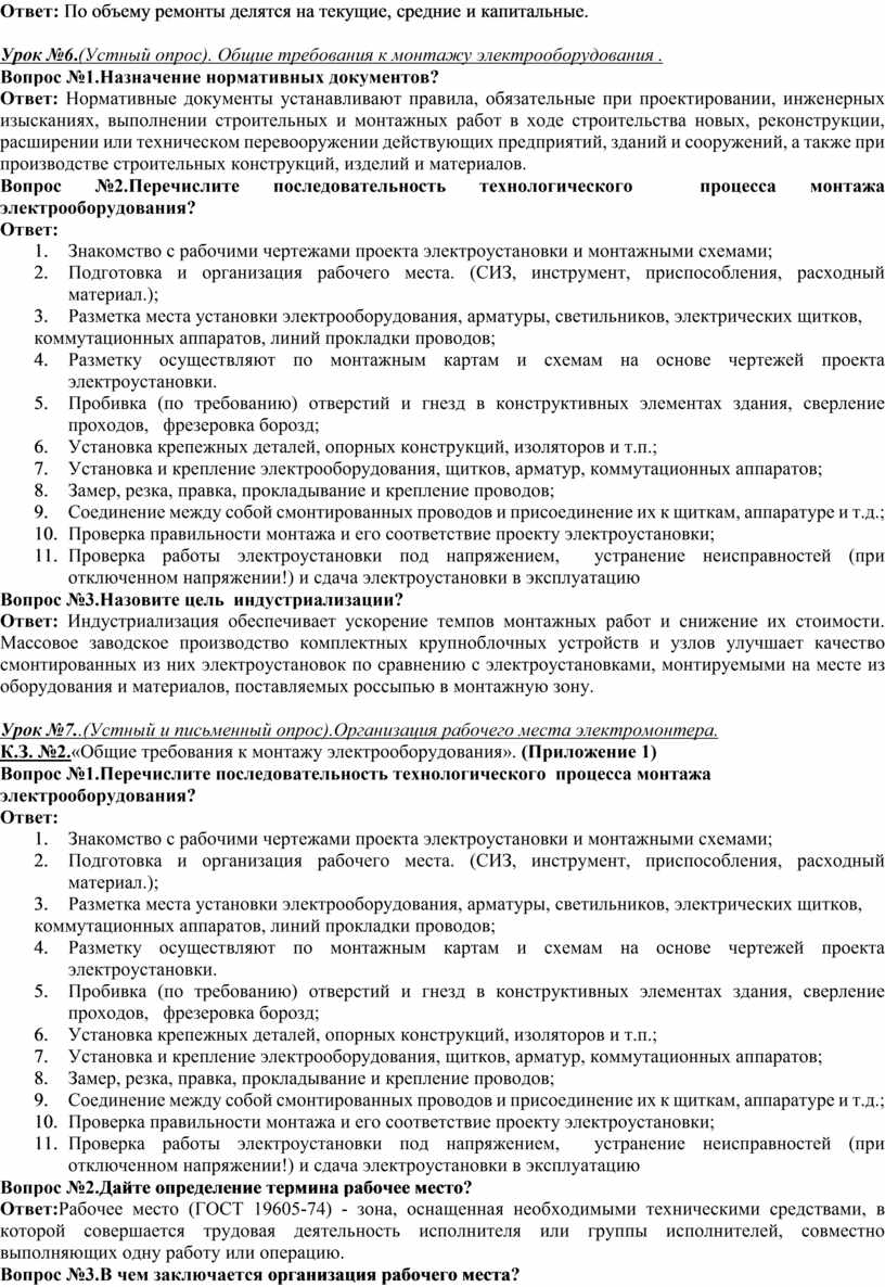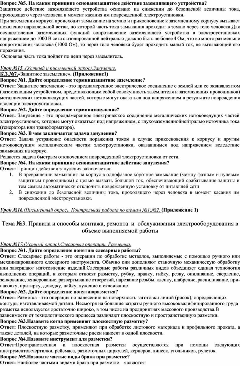 Вопрос№2. Перечислите видыработ, выполняемые электромонтером по обслуживанию и ремонту электрооборудования Ответ: Электромонтер по обслуживанию электрооборудования в цехах промышленных предприятий выполняет: 1. Профилактический осмотр электрооборудования; 2. Осмотр защитных средств, креплений, постов и кнопок управления; регулировку пускателей, реле, приборов и другого электрооборудования; 3. Контроль за соблюдением правил технической эксплуатации электроустановок; 4. Работы по устранению неисправностей электрооборудования; 5. Профилактические работы по поддержанию в исправном состоянии искусственного общего и местного освещения; 6. Проверку и устранение неисправностей в устройстве заземления; 7. Оформление технической документации по учету работы электрооборудования, регистрация неисправностей; 8. Обнаружение неисправностей в электрических цепях; 9. Разборка и сборка электроаппаратуры и электрооборудования; 10. Слесарные операции. (Нарезание резьбы, сверление, шлифование, опиловка напильниками, резка и рубка металлов, гибка и рихтовка); 11. Промывка и чистка деталей; 12. Замеры напряжения и тока в электрических цепях; 13. Замена сгоревших плавких вставок, электрических ламп и электродвигателей.