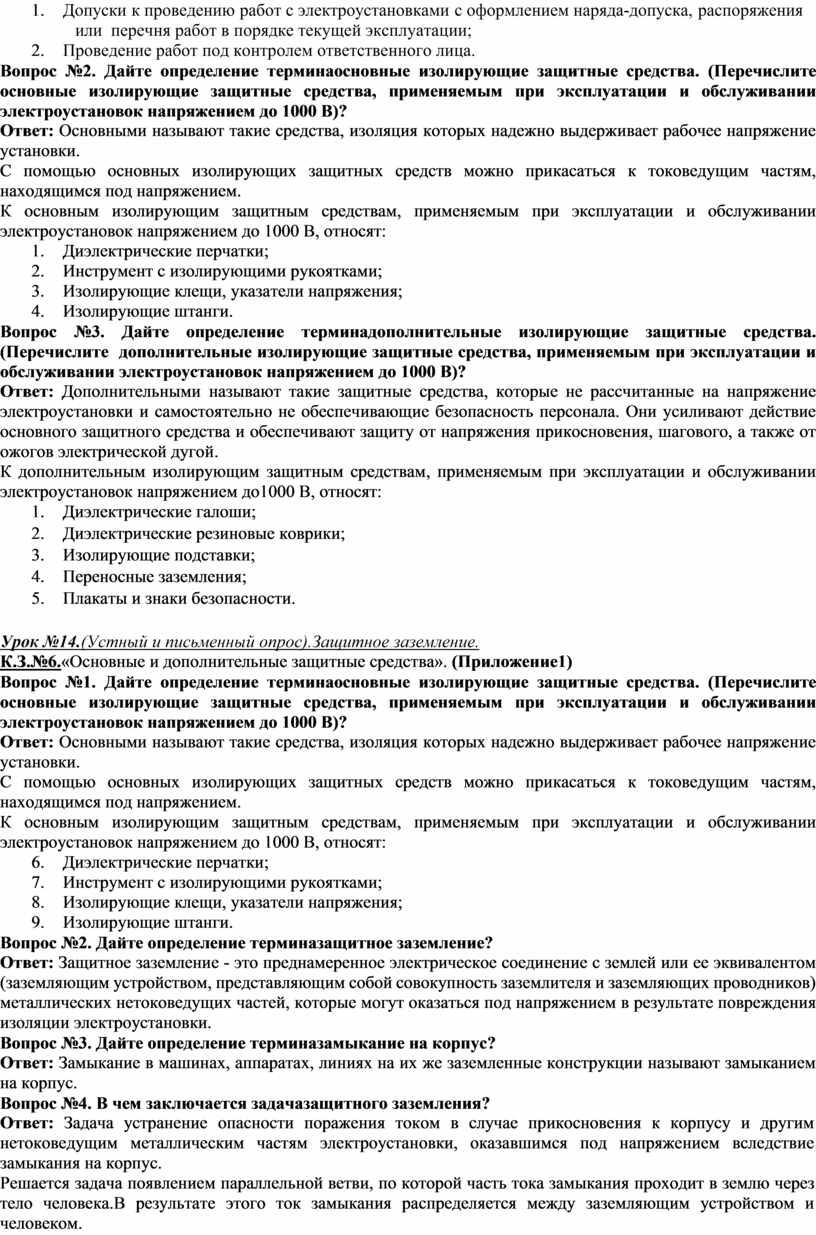 Вопрос№3.Назовите дополнительные изолирующие защитные средства, применяемым при эксплуатации и обслуживании электроустановок напряжением до 1000 В Ответ: Поражение электрическим током происходит при соприкосновении человека с токоведущими частями оборудования. Защитными называют такие средства, приборы, аппараты и приспособления, которые служат для защиты персонала, работающего вблизи находящихся под напряжением частей электротехнических установок. Дополнительными называют такие защитные средства, которые не рассчитанные на напряжение электроустановки и самостоятельно не обеспечивающие безопасность персонала. Они усиливают действие основного защитного средства и обеспечивают защиту от напряжения прикосновения, шагового, а также от ожогов электрической дугой. К дополнительным изолирующим защитным средствам, применяемым при эксплуатации и обслуживании электроустановок напряжением до1000 В, относят: 10. Диэлектрические галоши; 11. Диэлектрические резиновые коврики; 12. Изолирующие подставки; 13. Переносные заземления; 14. Плакаты и знаки безопасности.