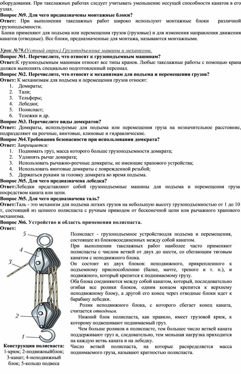 Вопрос№3.Перечислите механизмы для подъема и перемещения грузов. Раскройте понятие «Полиспаст» Ответ: К механизмам для подъема и перемещения грузов относят: 7. Домкраты; 8. Тали; 9. Тельферы; 10. Лебедки; 11. Тележки и др. Полиспаст - грузоподъемное устройство для подъема и перемещения, состоящее из блоков соединенных между собой канатом. При выполнении такелажных работ наиболее часто применяют полиспасты с числом ветвей от двух до шести, со сбегающим тяговым канатом с неподвижного блока.