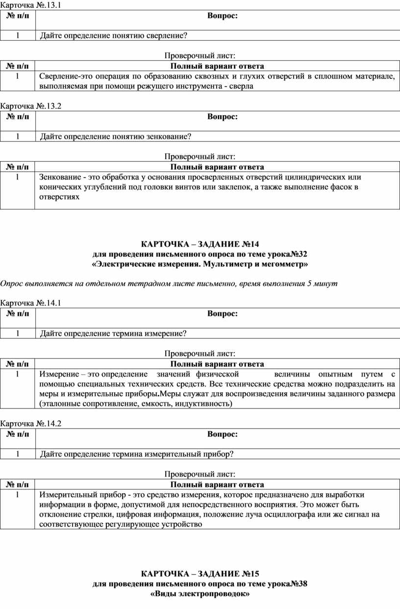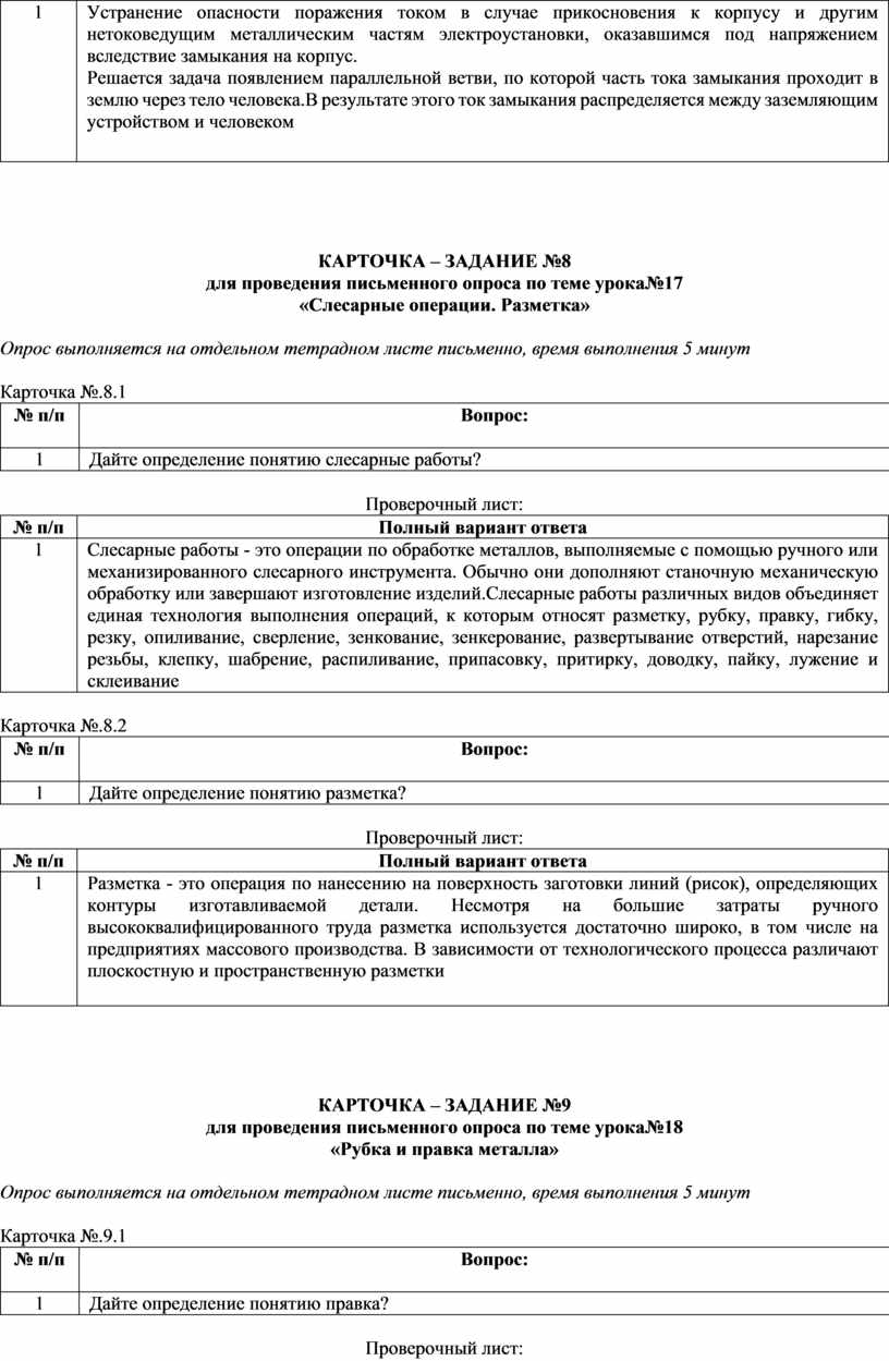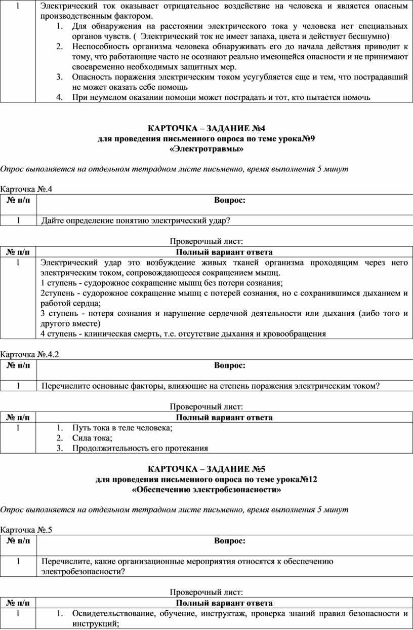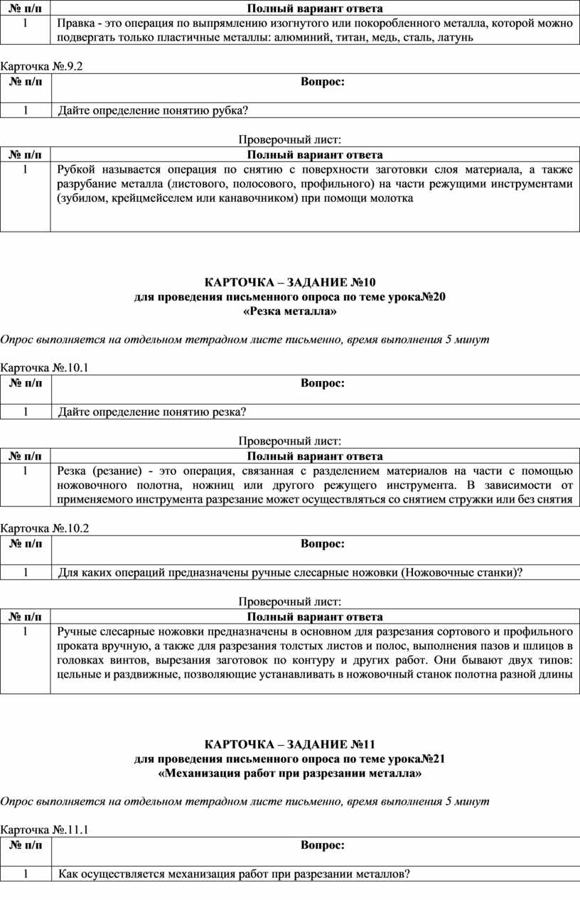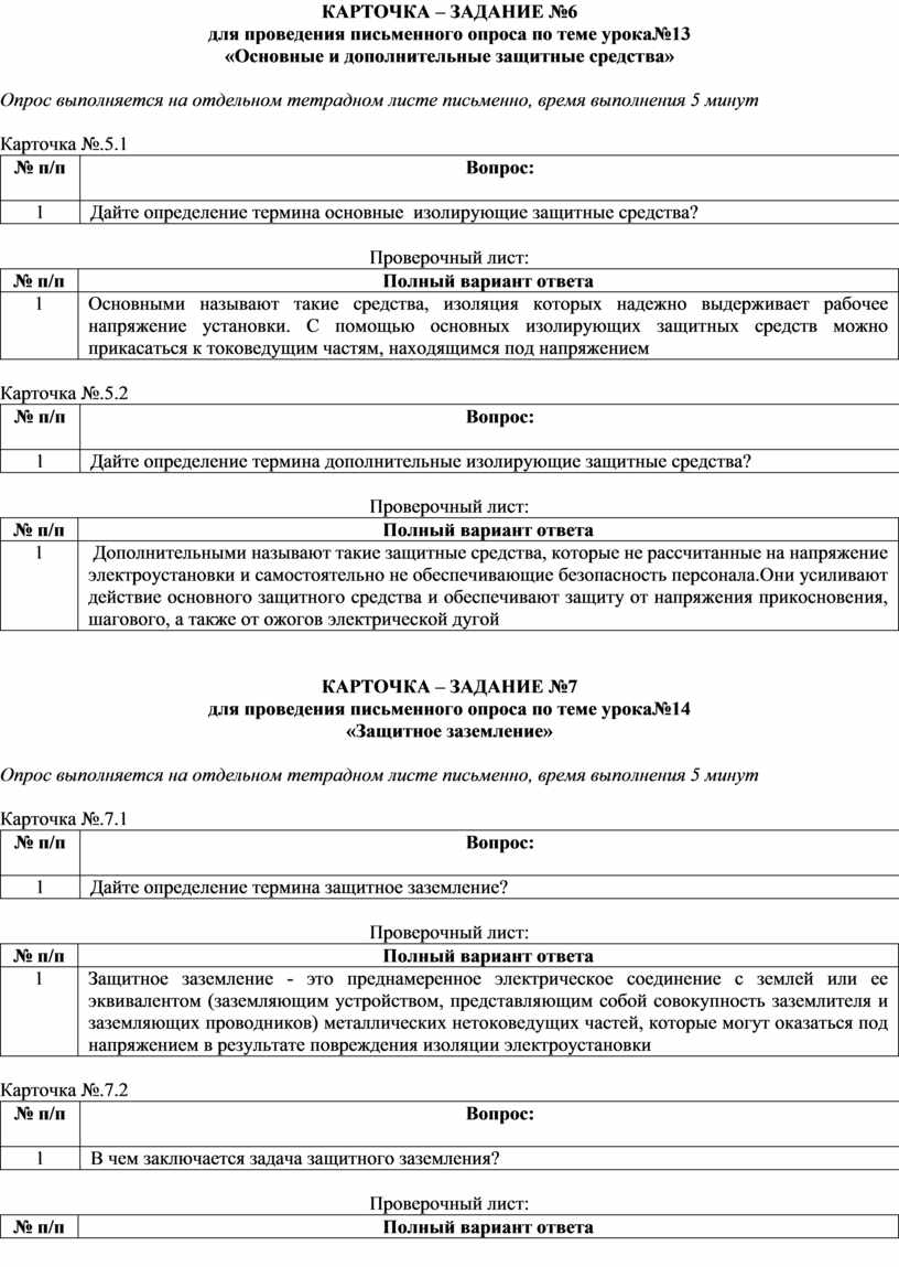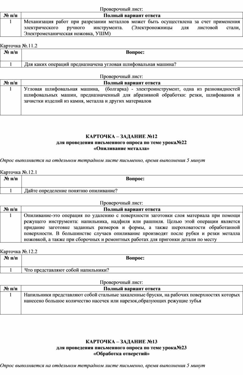 (вопросы по темам, карточки-задания)