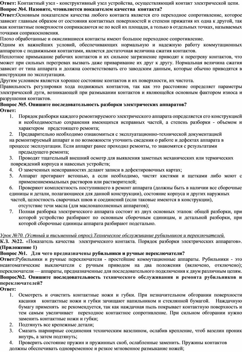 Вопрос№1.Изложите технологиюразборки электрических аппаратов Ответ: 1. Порядок разборки каждого ремонтируемого электрического аппарата определяется его конструкцией и необходимостью сохранения имеющихся исправных частей, а степень разборки - объемом и характером предстоящего ремонта. 2. Подготовка и организация рабочего места. (СИЗ, инструмент, приспособления, расходный материал.); 3. Предварительно необходимо ознакомиться с эксплуатационно-технической документацией на ремонтируемый аппарат и по возможности уточнить сведения о работе и дефектах аппарата в процессе эксплуатации. Если аппарат ранее проходил ремонты, то знакомятся с результатами предыдущего ремонта. 4. Проводят тщательный внешний осмотр для выявления заметных механических или термических повреждений корпуса и навесных устройств. 5. О замеченных неисправностях делают записи в дефектировочных картах. 6. Аппарат протирают ветошью, а если необходимо, чистят кистями и щетками либо моют с применениеммыльных растворов или растворителей. 7. Проверяют комплектность поступившего в ремонт аппарата (должны быть в наличии все сборочные единицы и детали, полагающиеся для данной конструкции), состояние корпуса и других наружных частей, целостность сварочных швов и соединений (если таковые имеются в конструкции), отсутствие течи масла (для маслонаполненных аппаратов). 8. Полная разборка электрического аппарата состоит из двух основных этапов: общей разборки, при которой устройство разбирают по основным сборочным единицам, и детальной разборки, при которой сборочные единицы аппарата разбирают подетально.