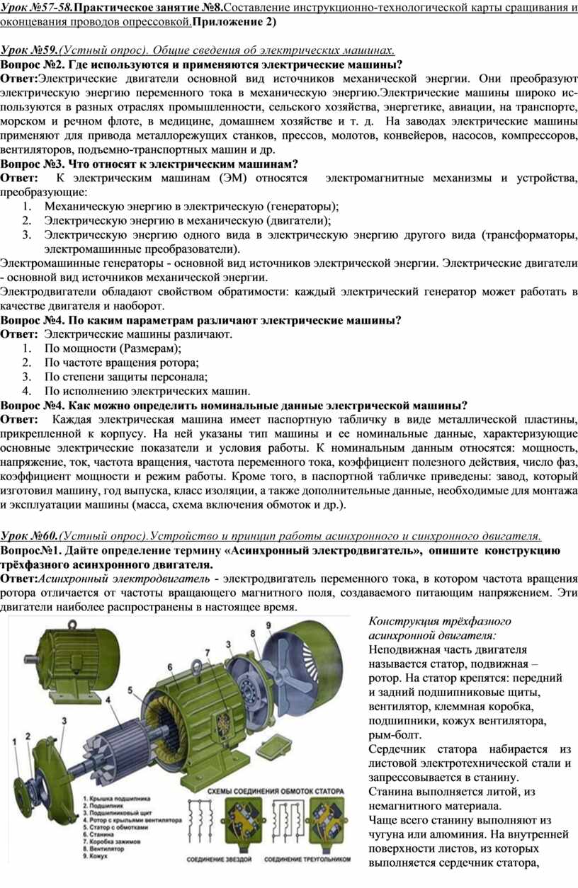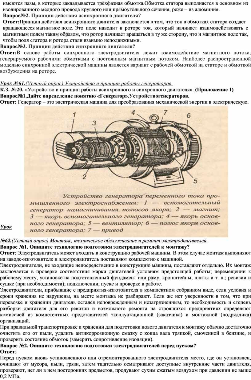 Вопрос№2. Дайте определение термину «Асинхронный электродвигатель», опишите конструкцию трёхфазного асинхронной двигателя Ответ: Электрические двигатели основной вид источников механической энергии. Они преобразуют электрическую энергию переменного тока в механическую энергию. Асинхронный электродвигатель- электродвигатель переменного тока, в котором частота вращения ротора отличается от частоты вращающего магнитного поля, создаваемого питающим напряжением. Эти двигатели наиболее распространены в настоящее время. Конструкция трёхфазного асинхронной двигателя: Неподвижная часть двигателя называется статор, подвижная – ротор. На статор крепятся: передний и задний подшипниковые щиты, вентилятор, клеммная коробка, подшипники, кожух вентилятора, рым-болт. Сердечник статора набирается из листовой электротехнической стали и запрессовывается в станину. Станина выполняется литой, из немагнитного материала.Чаще всего станину выполняют из чугуна или алюминия. На внутренней поверхности листов, из которых выполняется сердечник статора, имеются пазы, в которые закладывается трёхфазная обмотка.Обмотка статора выполняется в основном из изолированного медного провода круглого или прямоугольного сечения, реже – из алюминия.