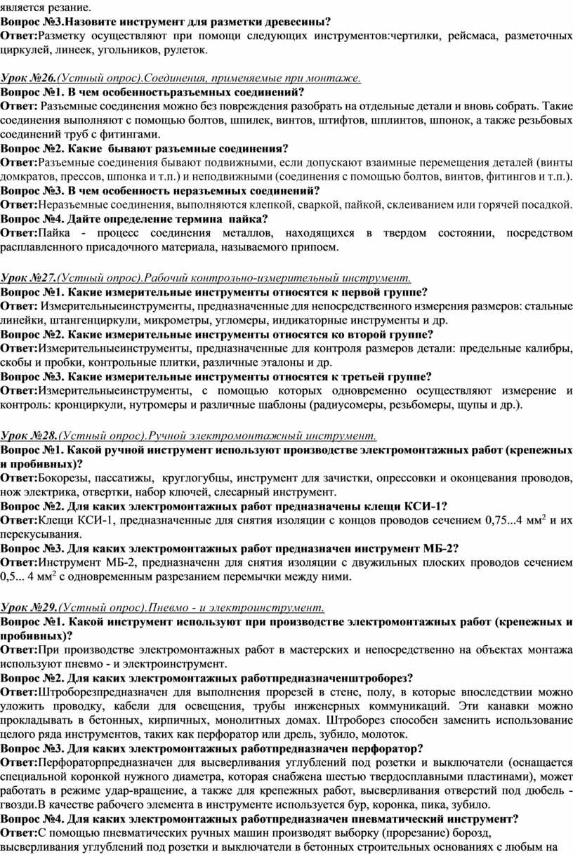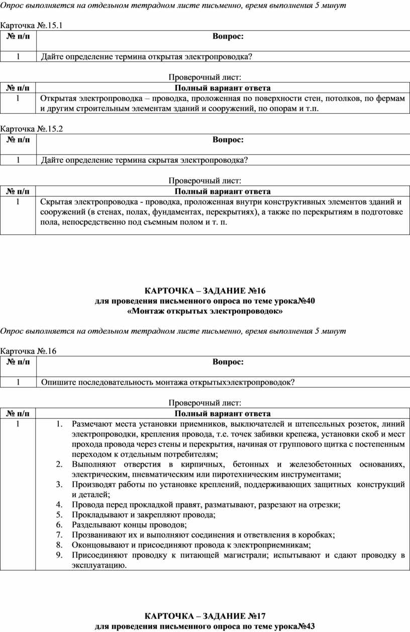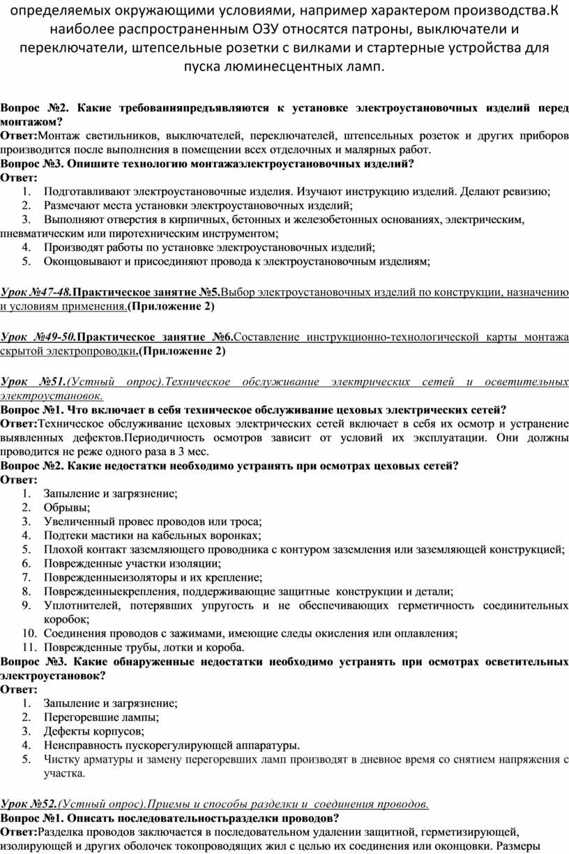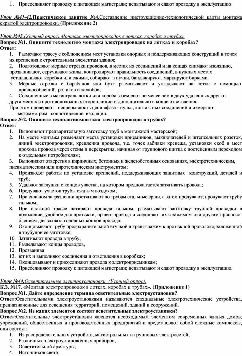 Вопрос№1.Опишите процесс монтажа открытых электропроводок Ответ: 1. Подготовить рабочее место (выбирают и подготавливают инструмент, приспособления и расходные материалы; 2. Сначала размечают места установки приемников, выключателей и штепсельных розеток, линий электропроводки, крепления провода, т.е. точек забивки крепежа, установки скоб и мест прохода провода через стены и перекрытия, начиная от группового щитка с постепенным переходом к отдельным потребителям; 3. Выполняют отверстия в кирпичных, бетонных и железобетонных основаниях, электрическим, 4. пневматическим или пиротехническим инструментами; 5. Производят работы по установке креплений, поддерживающих защитных конструкций и деталей; 6. Провода перед прокладкой правят, разматывают, разрезают на отрезки; 7. Прокладывают и закрепляют провода; 8. Разделывают концы проводов; 9. Прозванивают их и выполняют соединения и ответвления в коробках; 10. Оконцовывают и присоединяют провода к электроприемникам; 11. Присоединяют проводку к питающей магистрали; испытывают и сдают проводку в эксплуатацию.