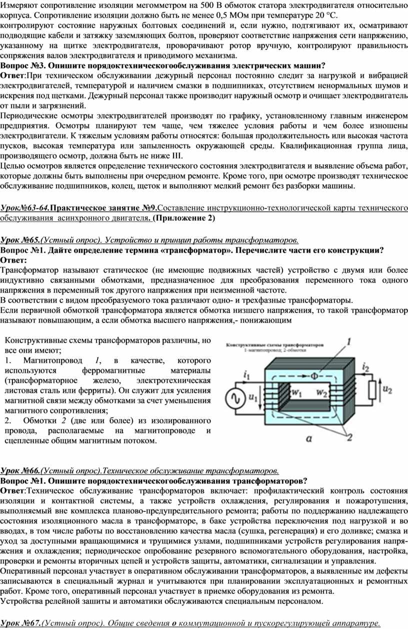Вопрос №2. Дайте определение термина «трансформатор».Перечислите части егоконструкции Ответ:Трансформатор называют статическое (не имеющие подвижных частей) устройство с двумя или более индуктивно связанными обмотками, предназначенное для преобразования переменного тока одного напряжения в переменный ток другого напряжения при неизменной частоте. Конструктивные схемы трансформаторов различны, но все они имеют; 3. Магнитопровод 1, в качестве, которого используются ферромагнитные материалы (трансформаторное железо, электротехническая листовая сталь или ферриты). Он служит для усиления магнитной связи между обмотками за счет уменьшения магнитного сопротивления; 4. Обмотки 2 (две или более) из изолированного провода, располагаемые на магнитопроводе и сцепленные общим магнитным потоком. В соответствии с видом преобразуемого тока различают одно- и трехфазные трансформаторы. Если первичной обмоткой трансформатора является обмотка низшего напряжения, то такой трансформатор называют повышающим, а если обмотка высшего напряжения,- понижающим.