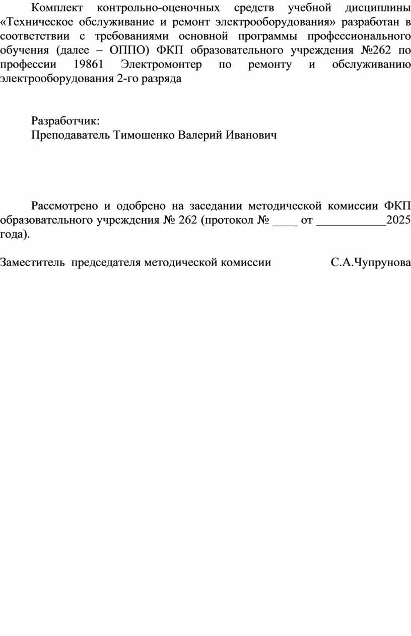 Комплект контрольно-оценочных средств учебной дисциплины «Техническое обслуживание и ремонт электрооборудования» разработан в соответствии с требованиями основной программы профессионального обучения (далее – ОППО) ФКП образовательного учреждения №262 по профессии 19861 Электромонтер по ремонту и обслуживанию электрооборудования 2-го разряда