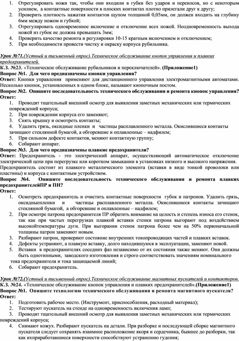 Вопрос№1.Изложите порядок технического обслуживания и ремонта коммутационной и пускорегулирующей аппаратуры(параметры задания: магнитный пускатель; обрыв проводников магнитной катушки) Ответ: 1. Подготовка и организация рабочего места. (СИЗ, инструмент, приспособления, расходный материал.); 2. Провести тщательный внешний осмотр корпуса для выявлений заметных механических или термическихповреждений; 3. Протестировать пускатель на стенде. (Лампы не включаются, нет питания на лампах); 4. Определить причину неисправности. (Неисправна магнитная катушка); 5. Снять кожух. Разобрать пускатель на детали. При разборке и последующей сборке магнитного пускателяследует сохранять взаимное расположение якоря и сердечника, бывшее до разборки, так как ихприработавшиеся поверхности способствуют устранению гудения; 6. Осмотреть магнитную катушку на наличие внешних повреждений. (Подтекание изоляции; прогар изоляции; повреждение корпуса); 7. Проверить магнитную катушку на обрыв проводников; 8. Подготовить мультиметр для прозвонки катушки переключатель на 200) м; 9. Оценить показания прибора (значение «0» обрыв); 10. Заменить магнитную катушку; 11. Собрать пускатель. 12. Протестировать пускатель на стенде на одновременность включения ламп (если все лампы загораются одновременно, неисправность устранена)