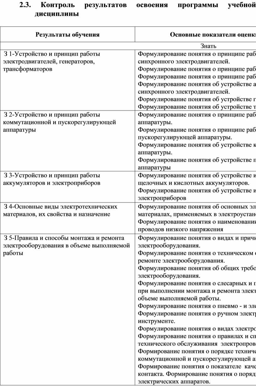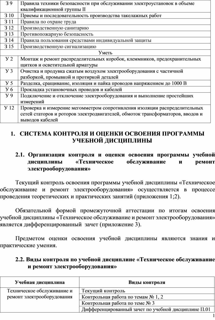 2.1. Организация контроля и оценки освоения программы учебной дисциплины «Техническое обслуживание и ремонт электрооборудования»