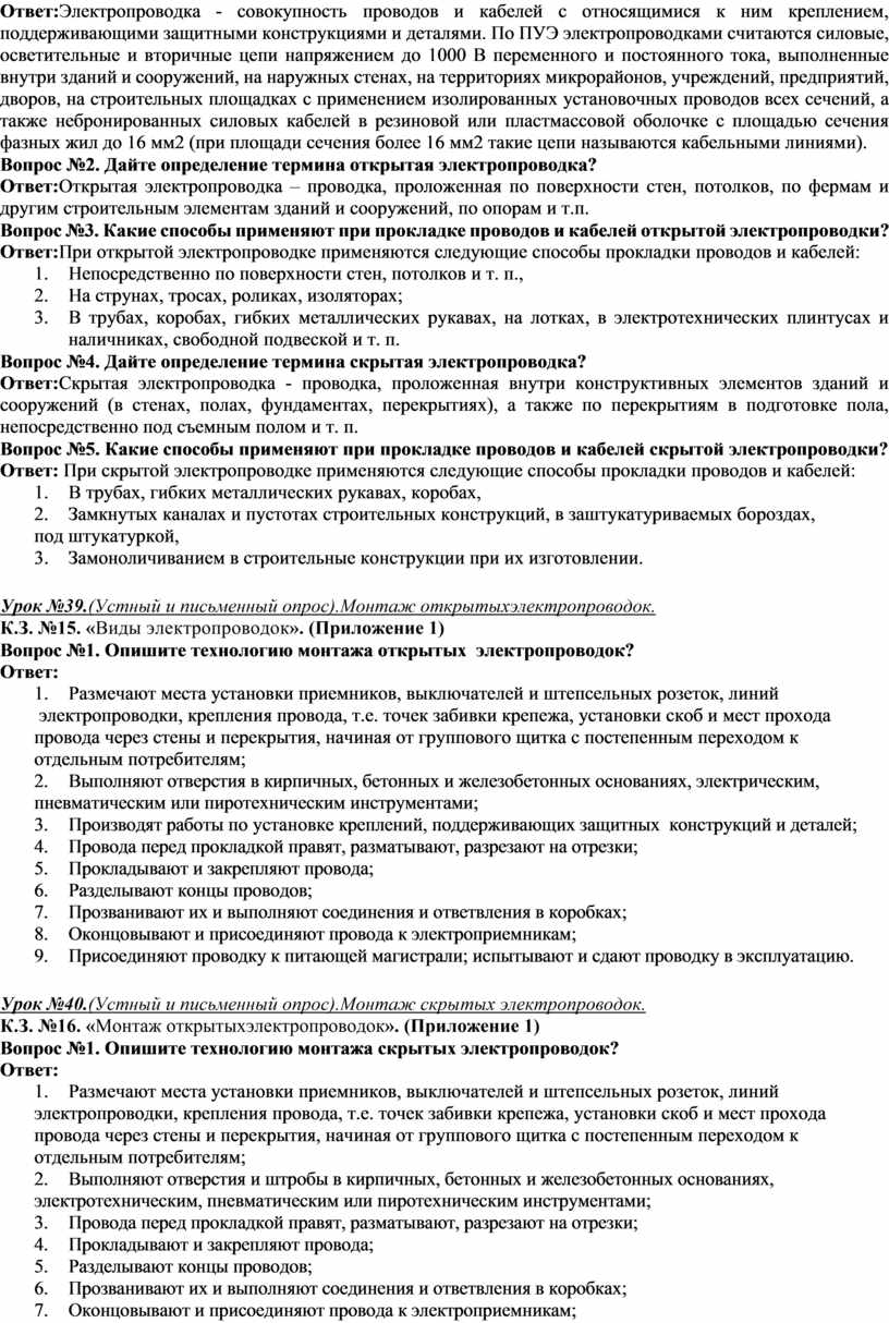 Вопрос№2.Дайте определение термина «Скрытая электропроводка» Ответ:Электропроводка- совокупность проводов и кабелей с относящимися к ним креплением, поддерживающими защитными конструкциями и деталями. По ПУЭ электропроводками считаются силовые, осветительные и вторичные цепи напряжением до 1000 В переменного и постоянного тока, выполненные внутри зданий и сооружений, на наружных стенах, на территориях микрорайонов, учреждений, предприятий, дворов, на строительных площадках с применением изолированных установочных проводов всех сечений, а также небронированных силовых кабелей в резиновой или пластмассовой оболочке с площадью сечения фазных жил до 16 мм2 (при площади сечения более 16 мм2 такие цепи называются кабельными линиями). Скрытая электропроводка - проводка, проложенная внутри конструктивных элементов зданий и сооружений (в стенах, полах, фундаментах, перекрытиях), а также по перекрытиям в подготовке пола, непосредственно под съемным полом и т. п. При скрытой электропроводке применяются следующие способы прокладки проводов и кабелей: 4. В трубах, гибких металлических рукавах, коробах, 5. Замкнутых каналах и пустотах строительных конструкций, в заштукатуриваемых бороздах, под штукатуркой, 6. Замоноличиванием в строительные конструкции при их изготовлении.