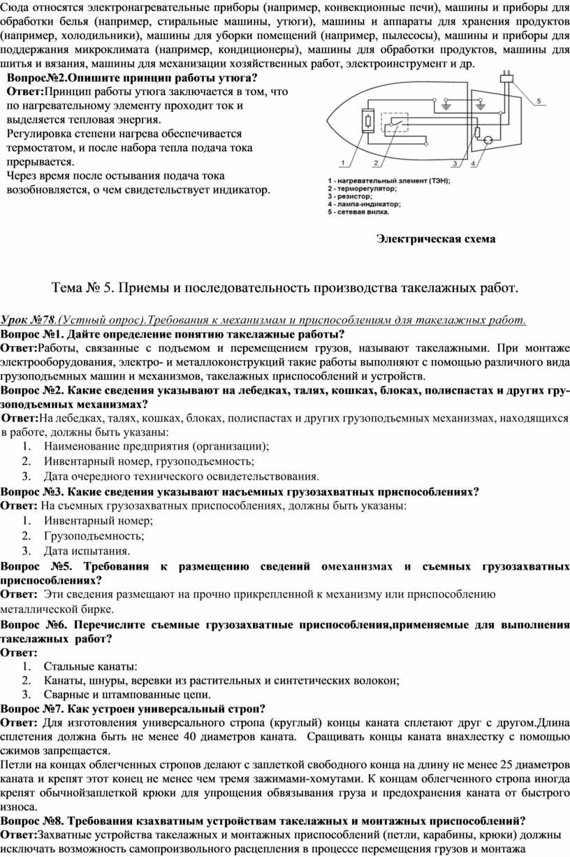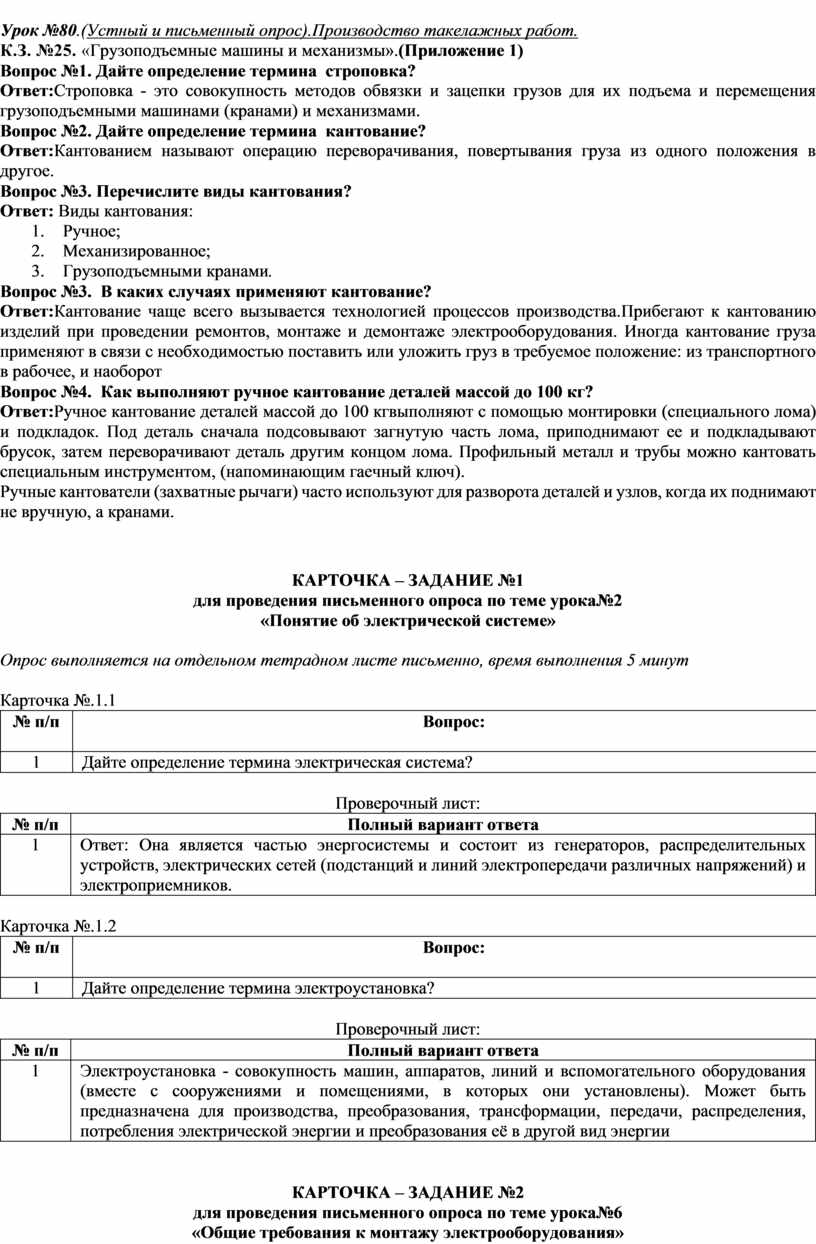 Вопрос№1.Опишите технологию монтажа осветительной арматуры Ответ: 1. Подготовка и организация рабочего места. (СИЗ, инструмент, приспособления, расходный материал.); 2. Выбирают и подготавливают осветительную арматуру. Изучают инструкцию изделий. 3. Выбирают и подготавливают инструмент, приспособления и расходные материалы; 4. Делают ревизию арматуры; 5. Размечают места установки; 6. Выполняют отверстия в кирпичных, бетонных и железобетонных основаниях электрическим, пневматическим или пиротехническим инструментом; 7. Производят работы по установке креплений, поддерживающих защитных конструкций и деталей; 8. Производят работы по установке осветительной арматуры; 9. Оконцовывают и присоединяют провода к осветительной арматуре; 10. Проводят приемо-сдаточные работы. Проверяют непрерывность цепи «фаза - нуль», контактных соединений и измеряют мегомметром сопротивление изоляции; 11. Устанавливают источники света; 12. Проверяем включением светильника. Вопрос№2.Дайте определение понятию «Такелажные работы» (строповка) Ответ: Работы, связанные с подъемом и перемещением грузов, называют такелажными. При монтаже электрооборудования, электро- и металлоконструкций такие работы выполняют с помощью различного вида грузоподъемных машин и механизмов, такелажных приспособлений и устройств. Выбор способа выполнения такелажных работ во многом зависит от состояния монтажной зоны, строительной готовности зданий и сооружений, наличия грузоподъемных средств, имеющейся такелажной оснастки, организации рабочего места такелажников и разработки технологического процесса. Строповка - это совокупность методов обвязки и зацепки грузов для их подъема и перемещения грузоподъемными машинами (кранами).