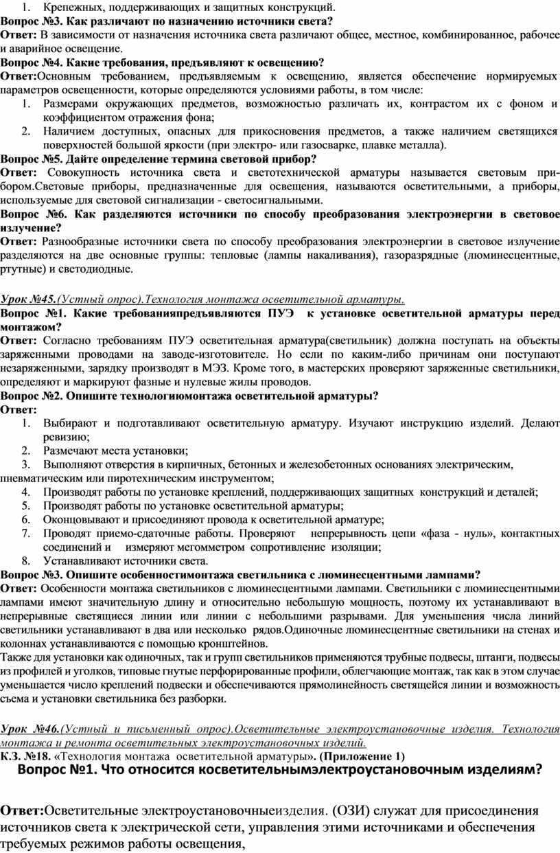 Вопрос №2.Перечислите элементы осветительных электроустановок Ответ: Осветительные электроустановки являются необходимым элементом современных жилых домов, учреждений, общественных и производственных предприятий и представляют собой сложные комплексы, они состоят: 6. Из распределительных устройств, магистральных и групповых электросетей; 7. Различных электроустановочных приборов(выключатели, розетки, распределительные коробки); 8. Осветительной арматуры; 9. Источников света(лампы светодиодные, люминесцентные, накаливания и др.) 10. Крепежных, поддерживающих и защитных конструкций.