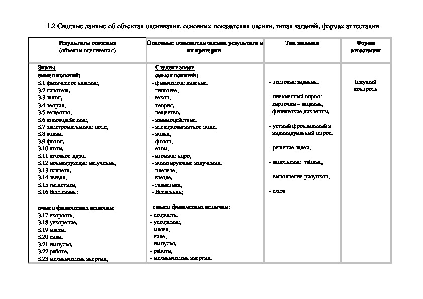природе, обществу, человеку.1.2 Сводные данные об объектах оценивания, основных показателях оценки, типах заданий, формах аттестации