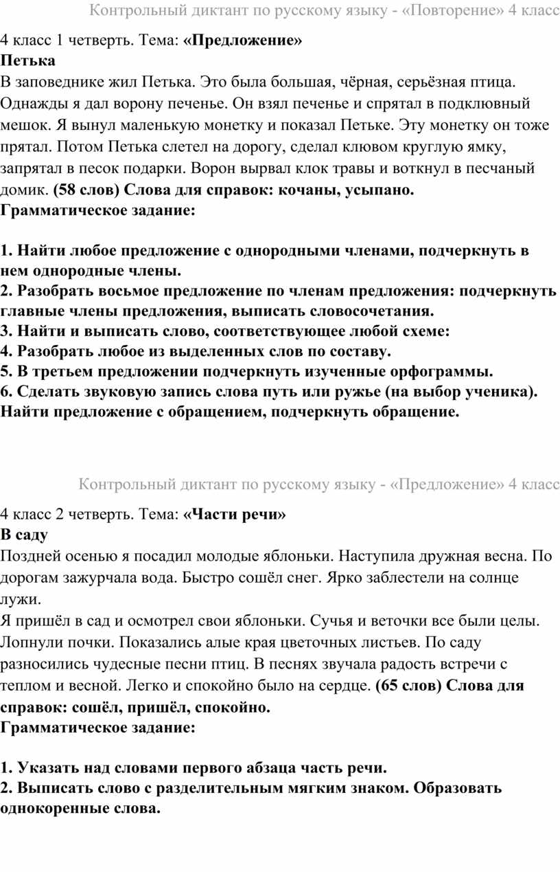 Контрольный диктант по русскому языку - «Предложение» 4 класс
