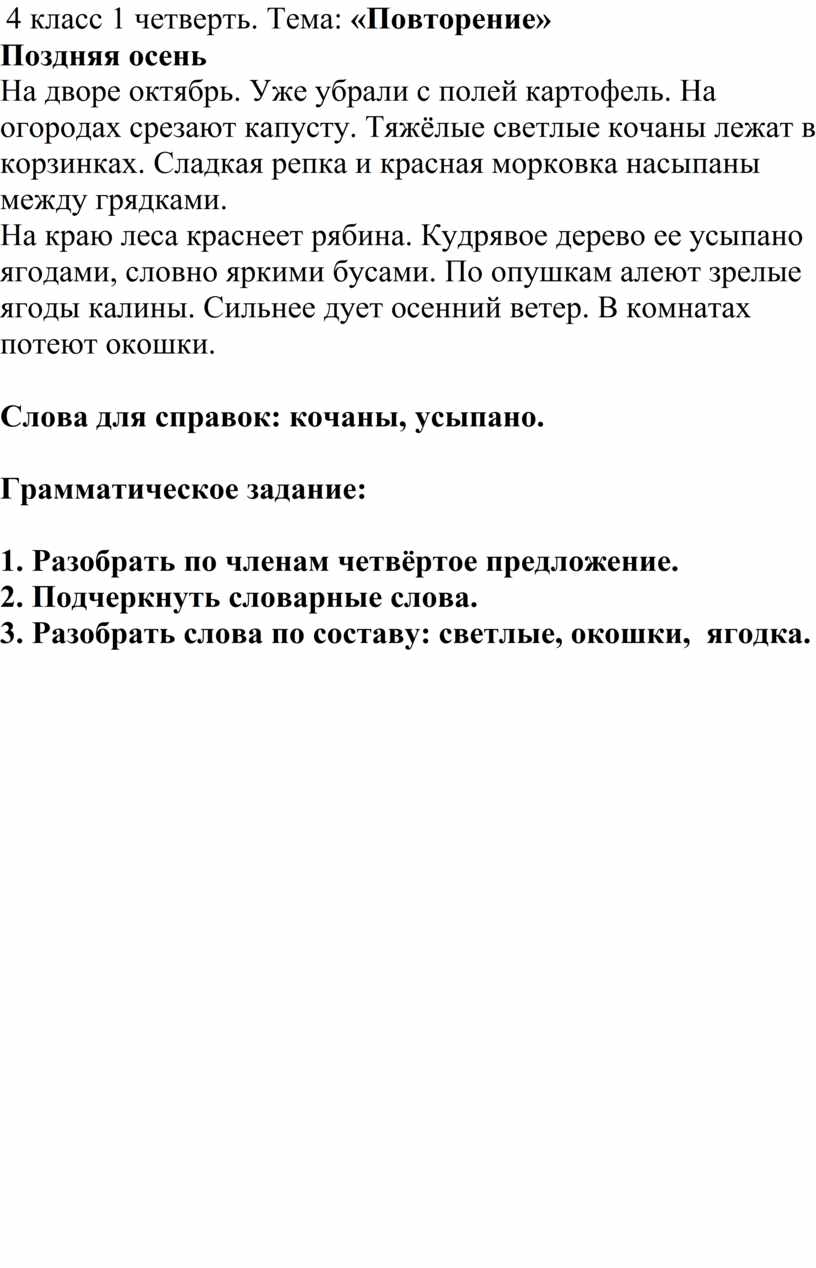 Контрольный диктант по русскому языку - «Повторение» 4 класс
