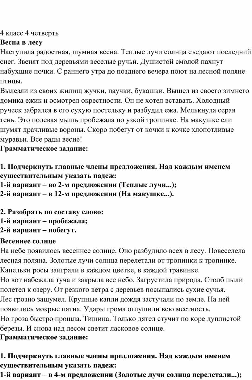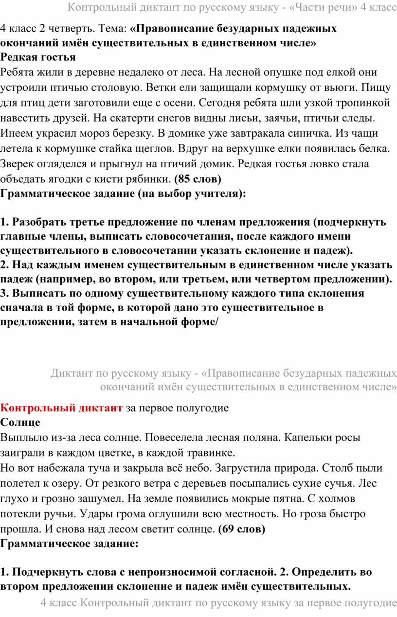 Контрольный диктант по русскому языку - «Части речи» 4 класс