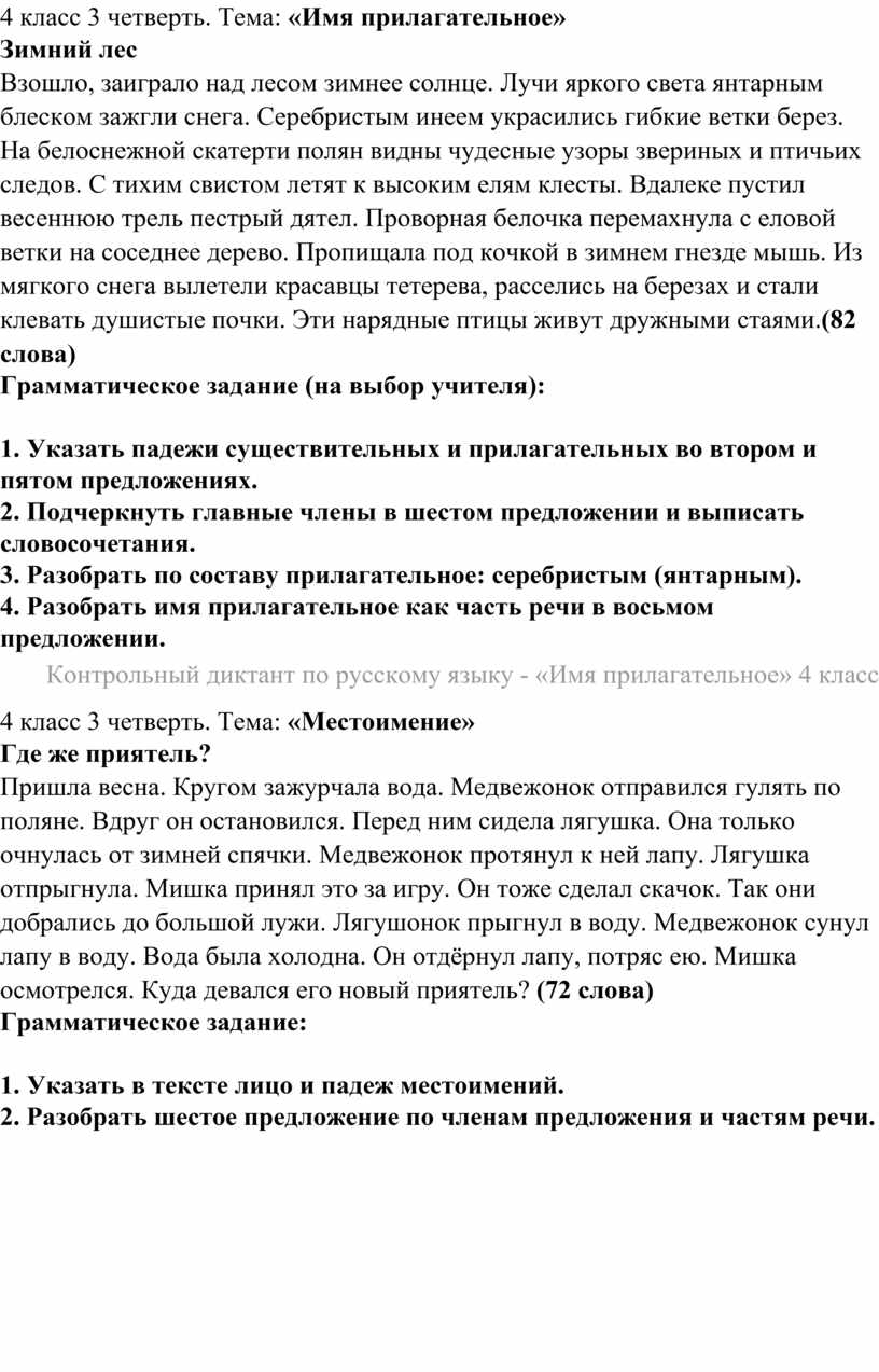 Контрольный диктант по русскому языку - «Имя прилагательное» 4 класс
