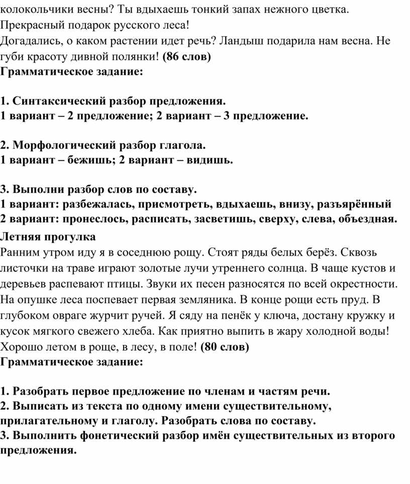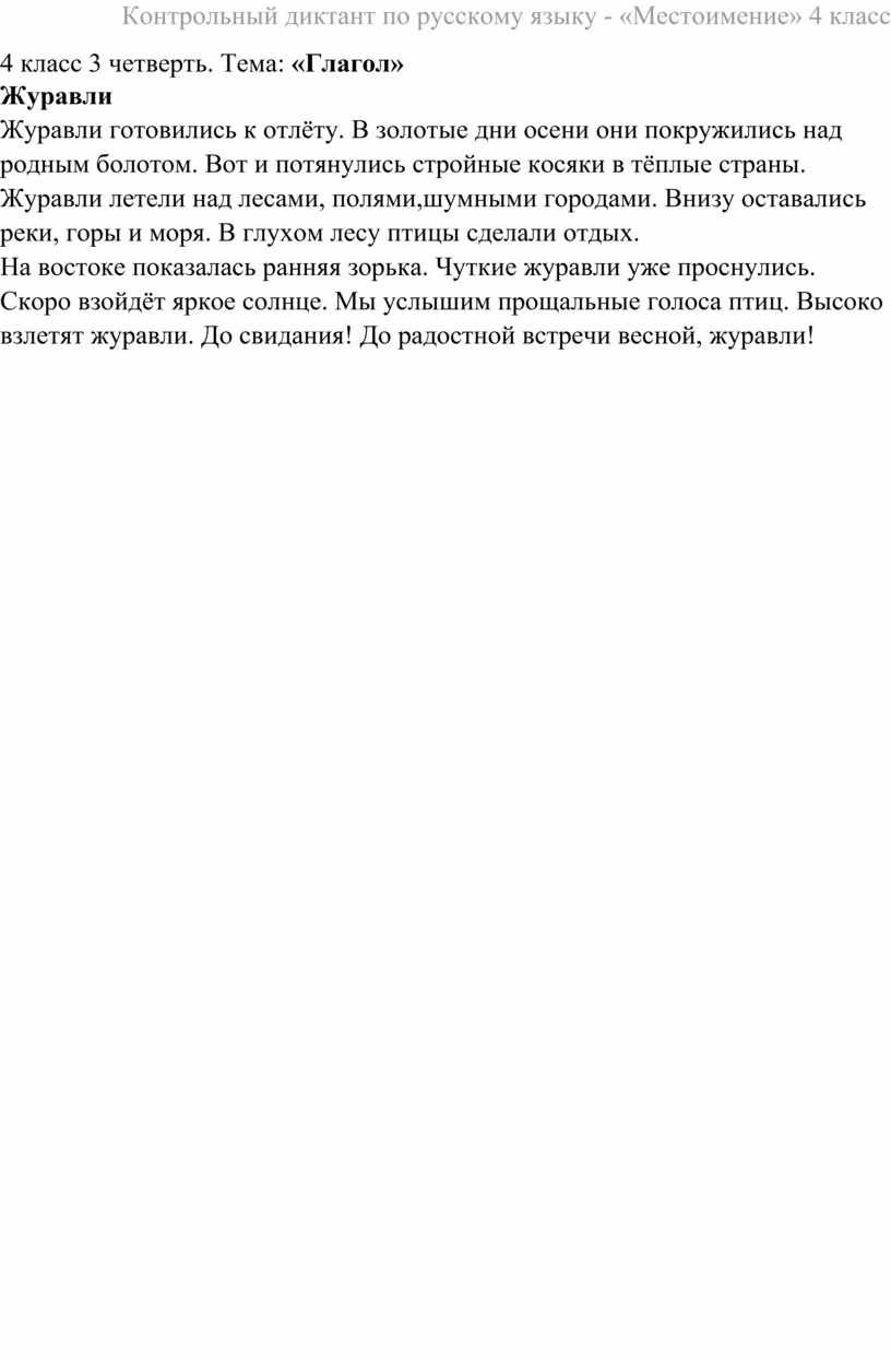 Контрольный диктант по русскому языку - «Глагол» 4 класс