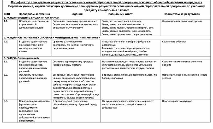 Кодификатор планируемых результатов освоения основной образовательной программы основного общего образования по предмету Перечень умений, характеризующих достижение планируемых результатов освоения основной образовательной программы по учебному предмету «Биология» в 5 классе КОД Проверяемые умения Задания Правильный ответ Планируемые результаты |