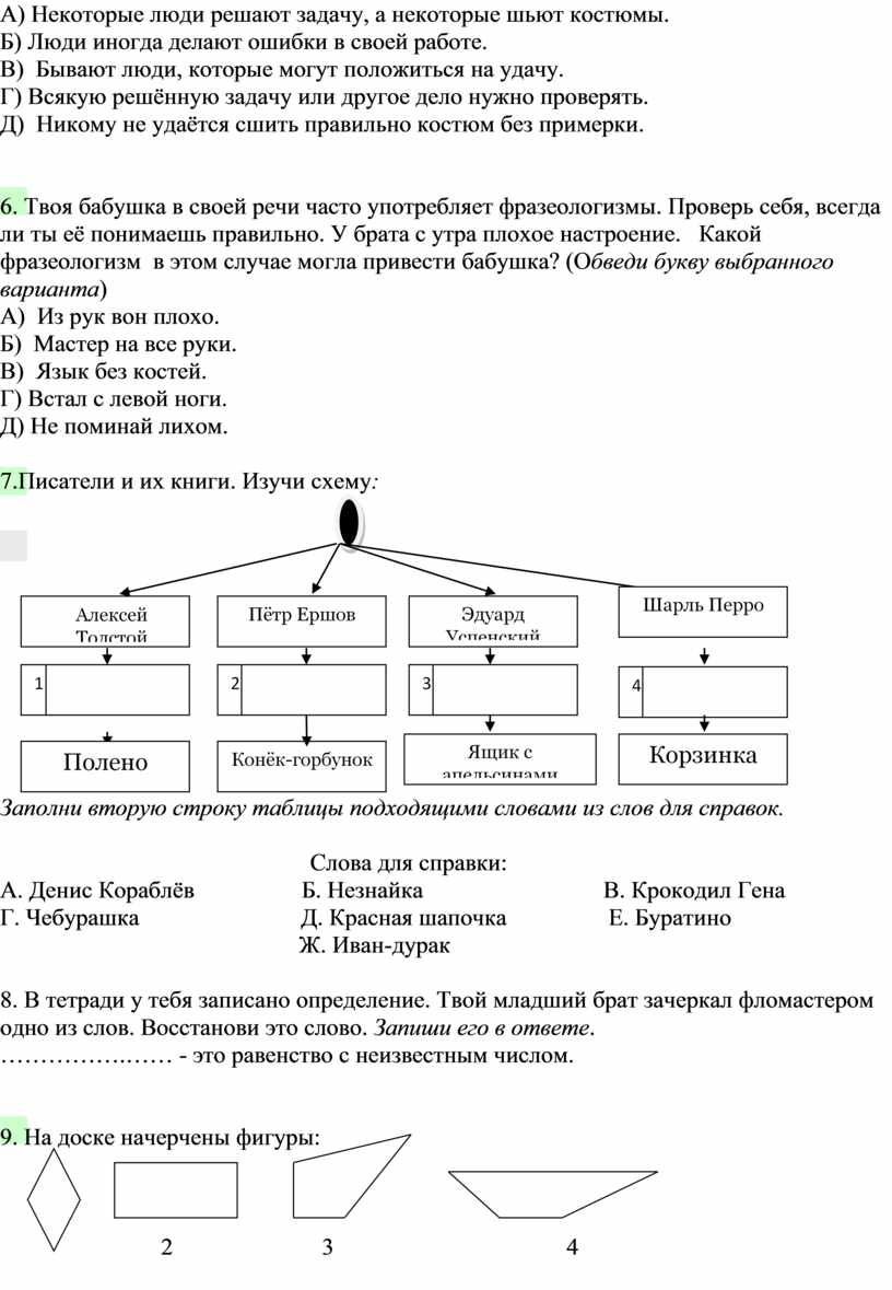 Г. Чебурашка Д. Красная шапочка Е. Буратино Ж. Иван-дурак