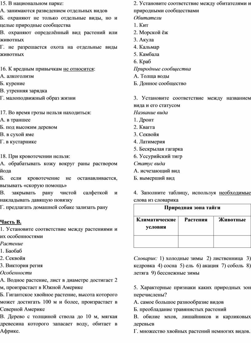 5 класс. Контрольная работа № 3 по разделам «Среда обитания живых организмов», «Человек на Земле»