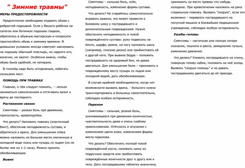 Что делать? Не старайтесь самостоятельно вправить вывихи, это может привести к болевому шоку у пострадавшего и дополнительным повреждениям. Нужно обеспечить неподвижность и покой повреждённого сустава: руку подвесить на бинте, шарфе, ремне, на ногу наложить шину (например, плоские доски) или прибинтовать её к другой ноге. При вывихе бедра – положить пострадавшего на здоровый бок, не давая двигаться. Для уменьшения боли – приложить к повреждённому месту пузырь со льдом или холодной водой, дать обезболивающее.
