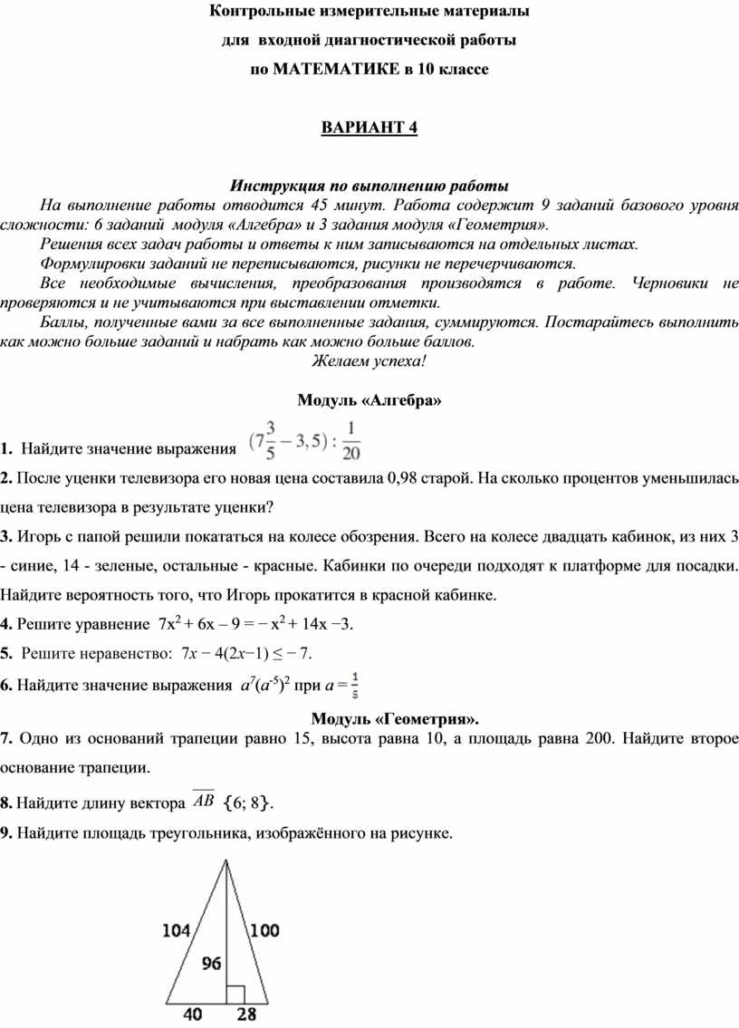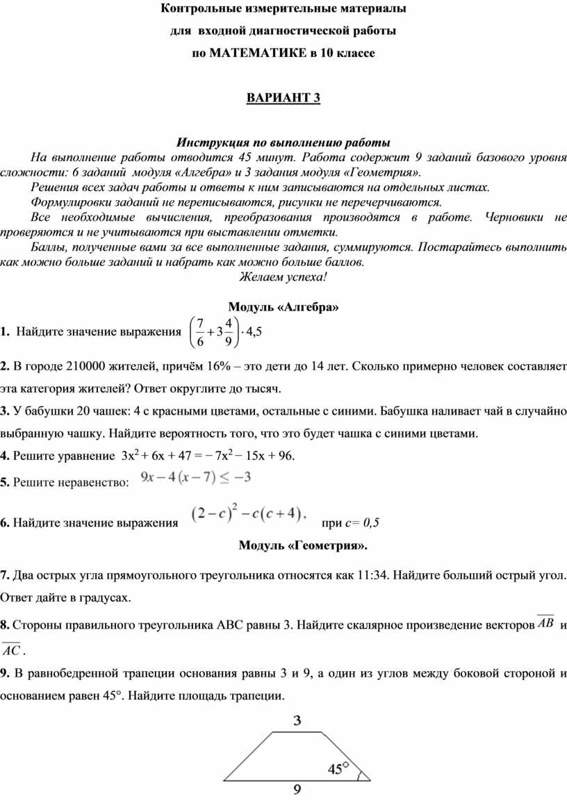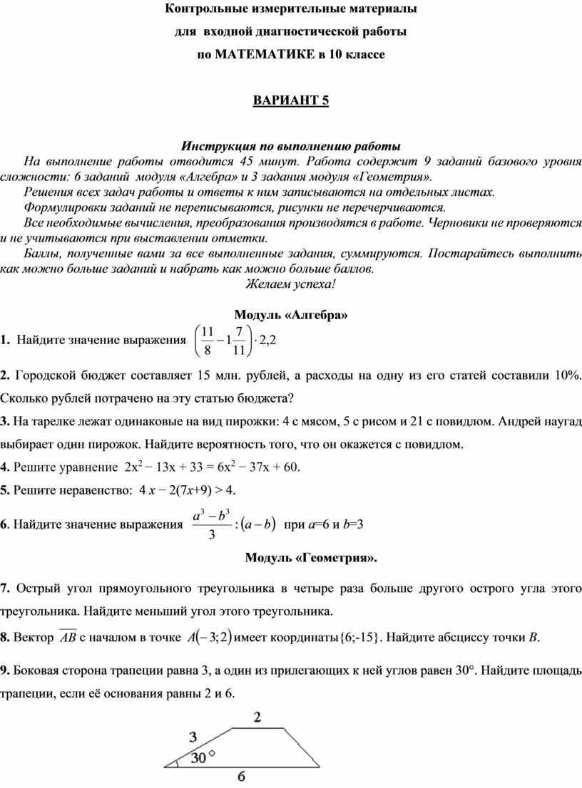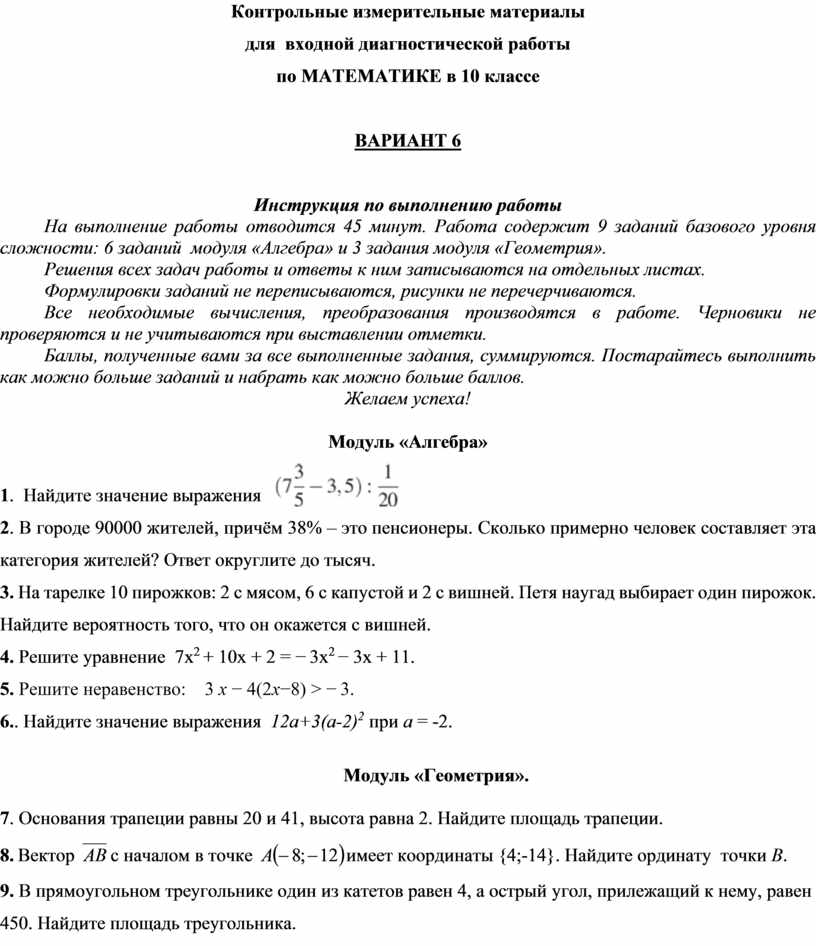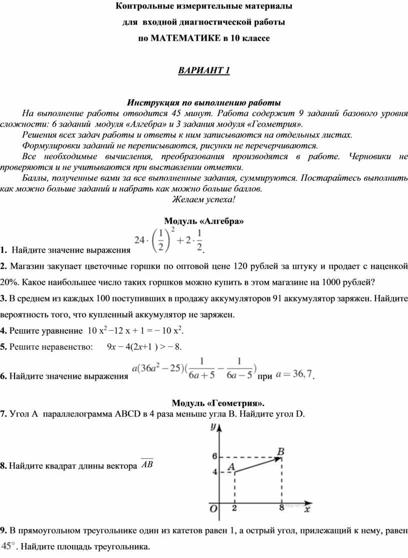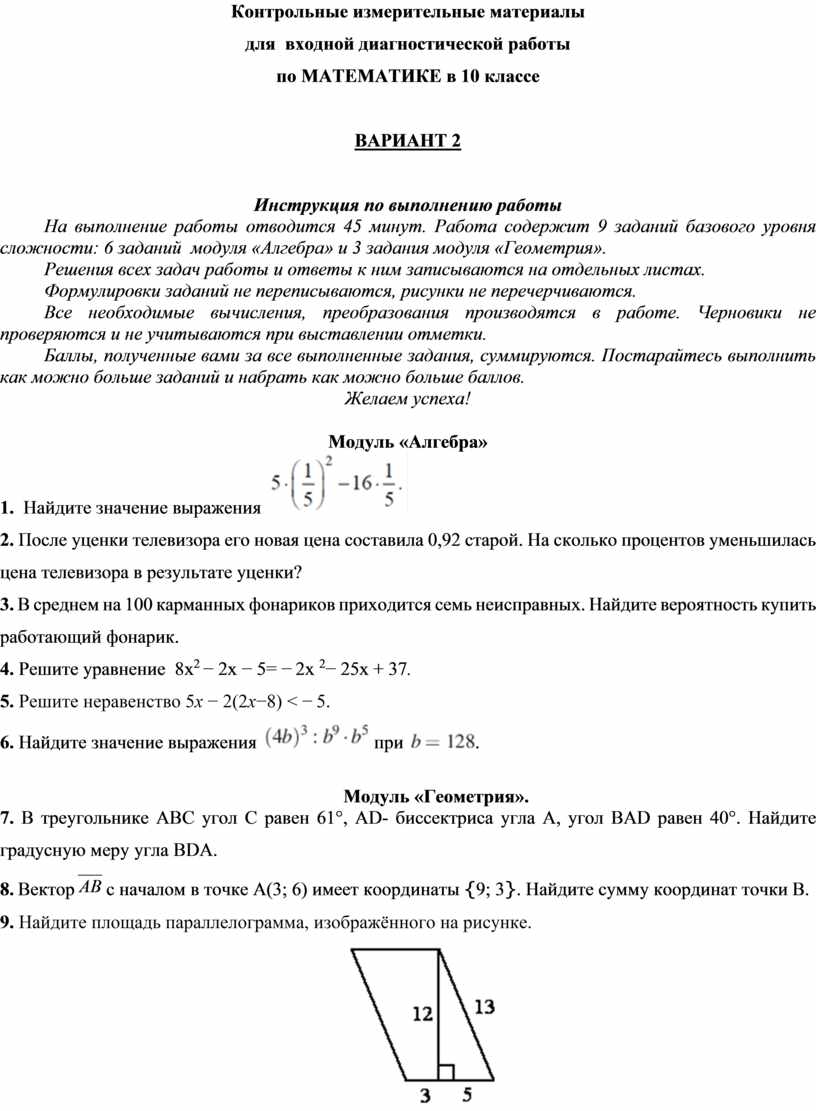 На выполнение работы отводится 45 минут. Работа содержит 9 заданий базового уровня сложности: 6 заданий модуля «Алгебра» и 3 задания модуля «Геометрия».