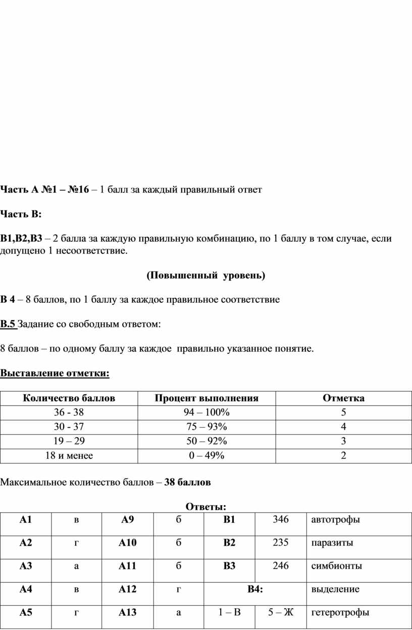 Часть А №1 – №16 – 1 балл за каждый правильный ответ