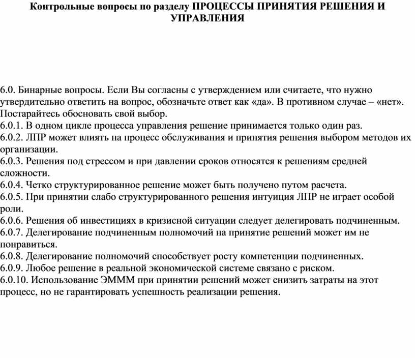 Контрольные вопросы по разделу ПРОЦЕССЫ ПРИНЯТИЯ РЕШЕНИЯ И УПРАВЛЕНИЯ