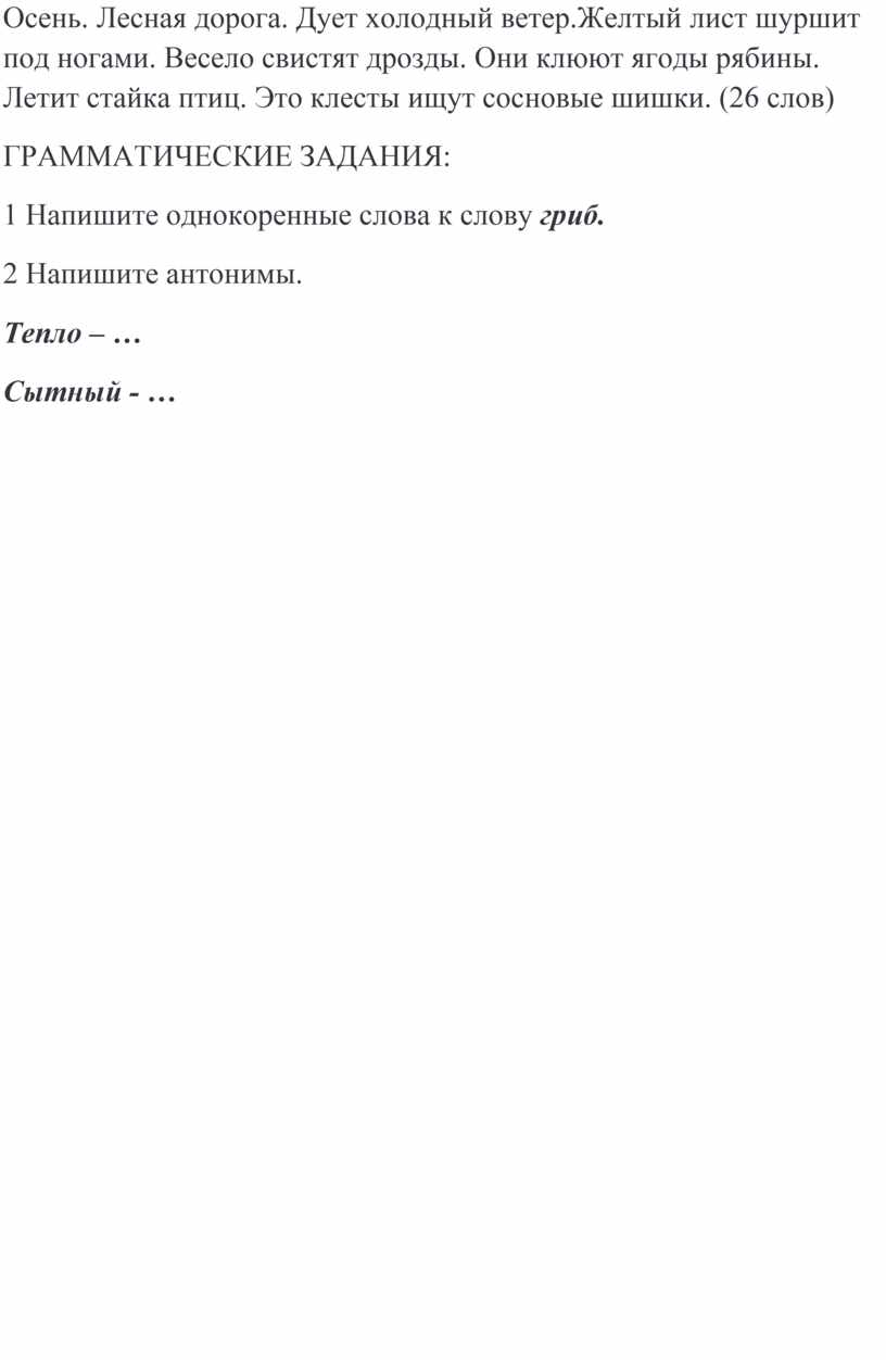 Осень. Лесная дорога. Дует холодный ветер.Желтый лист шуршит под ногами. Весело свистят дрозды. Они клюют ягоды рябины. Летит стайка птиц. Это клесты ищут сосновые шишки. (26 слов)