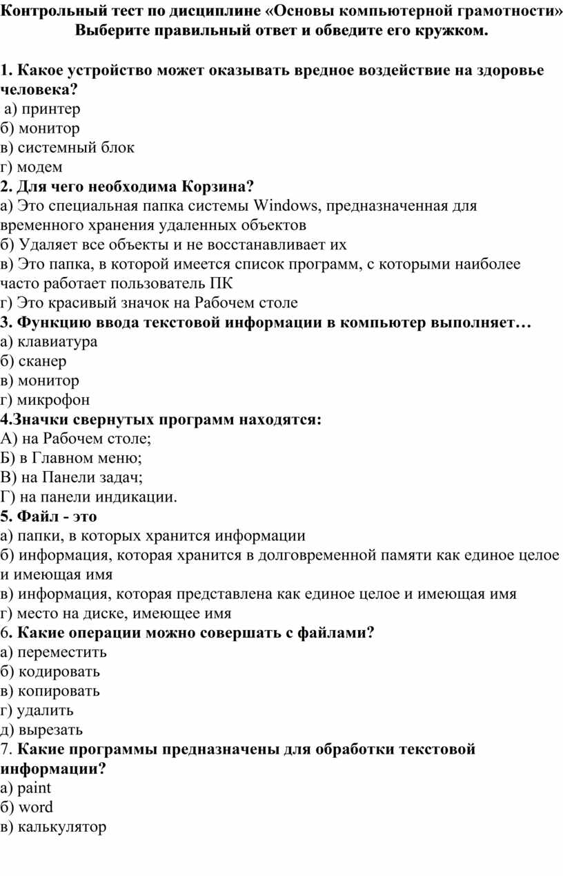 Контрольный тест по дисциплине «Основы компьютерной грамотности»
