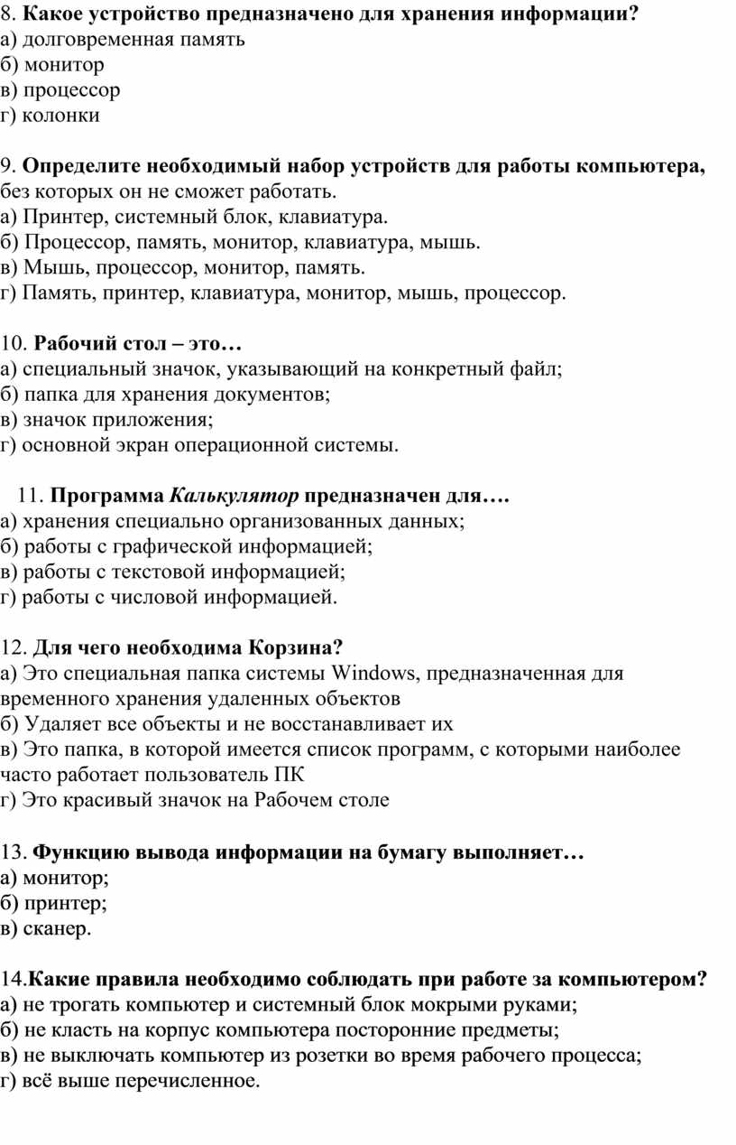 9. Определите необходимый набор устройств для работы компьютера, без которых он не сможет работать.