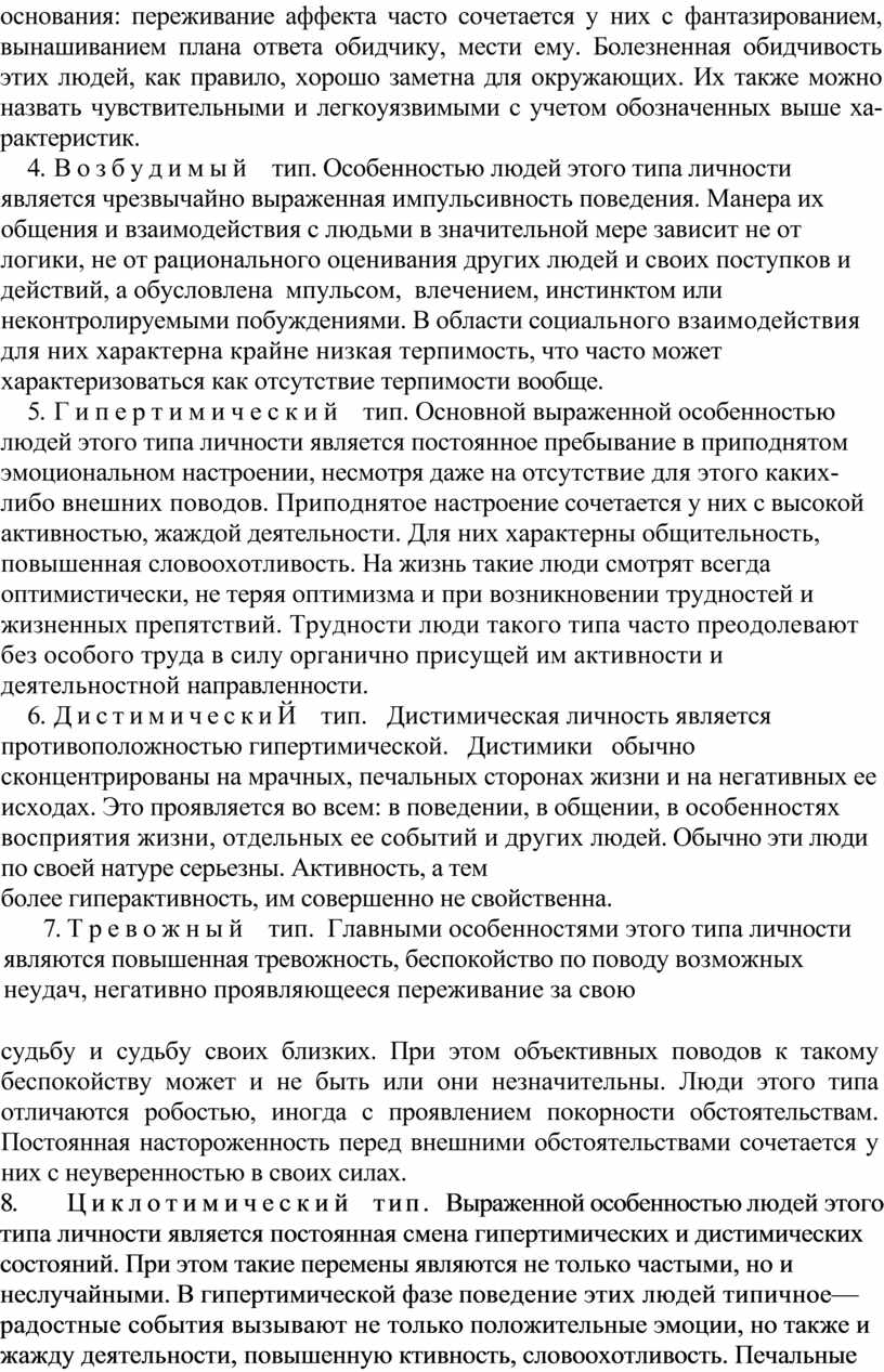 8. Циклотимический тип. Выраженной особенностью людей этого типа личности является постоянная смена гипертимических и дистимических состояний. При этом такие перемены являются не только частыми, но и неслучайными. В гипертимической фазе поведение этих людей типичное— радостные события вызывают не только положительные эмоции, но также и жажду деятельности, повышенную ктивность, словоохотливость. Печальные события вызывают у этих людей не только огорчение, но и подавленность. В этом состоянии для них характерны замедленность реакций, переживаний и мышлений, замедление и снижение эмоциональной отзывчивости, способности к сопереживанию и сочувствию.