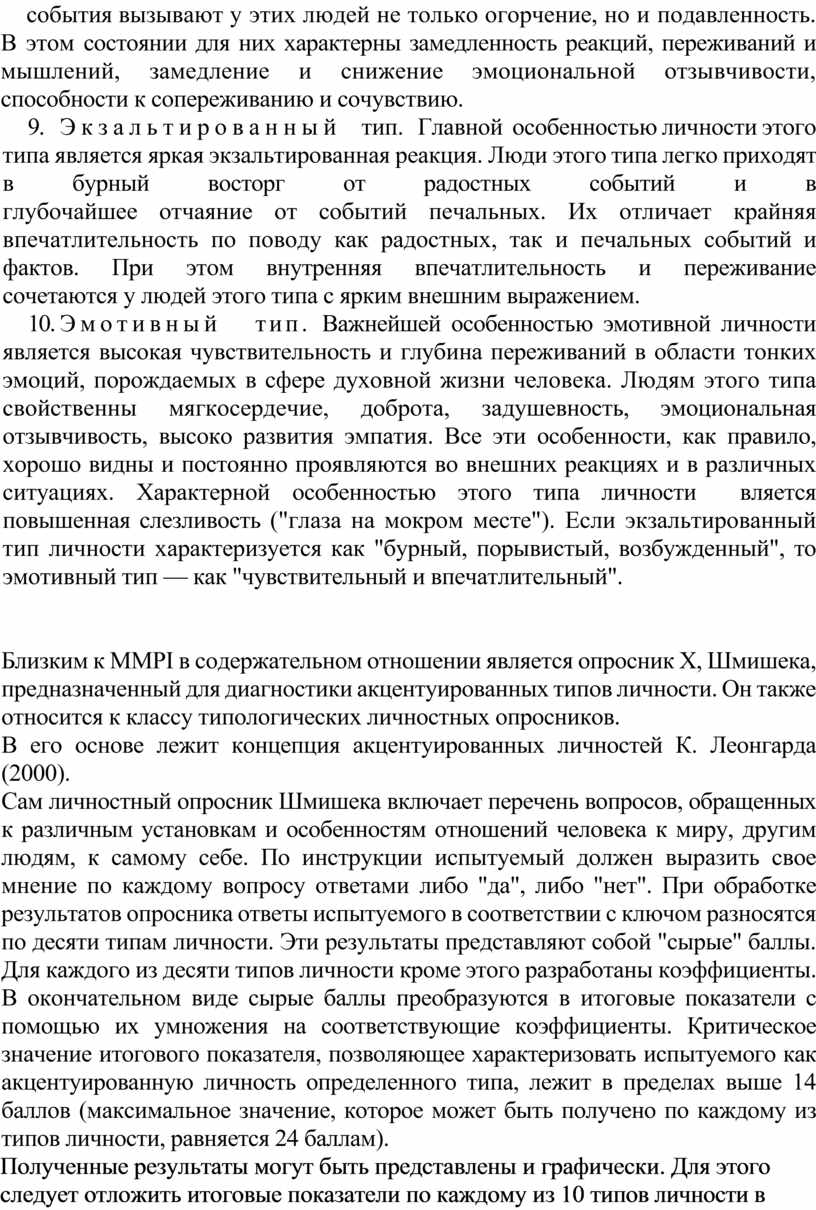 Близким к MMPI в содержательном отношении является опросник X, Шмишека, предназначенный для диагностики акцентуированных типов личности. Он также относится к классу типологических личностных опросников.