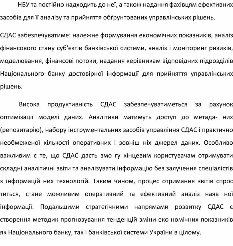Висока продуктивність СДАС забезпечуватиметься за рахунок оптимізації моделі даних. Аналітики матимуть доступ до метада- них (репозитарію), набору інструментальних засобів управління СДАС і практично необмеженої кількості оперативних і зовніш ніх джерел даних. Особливо важливим є те, що СДАС дасть змо гу кінцевим користувачам отримувати складні аналітичні звіти та аналізувати інформацію без залучення спеціалістів з інформацій них технологій. Таким чином, процес отримання звітів спрос титься, стане можливим оперативний та ефективний аналіз наяв ної інформації. Подальшими стратегічними напрямами розвитку СДАС є створення методик прогнозування тенденцій зміни еко номічних показників як Національного банку, так і банківської системи України в цілому.