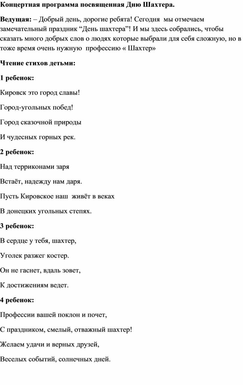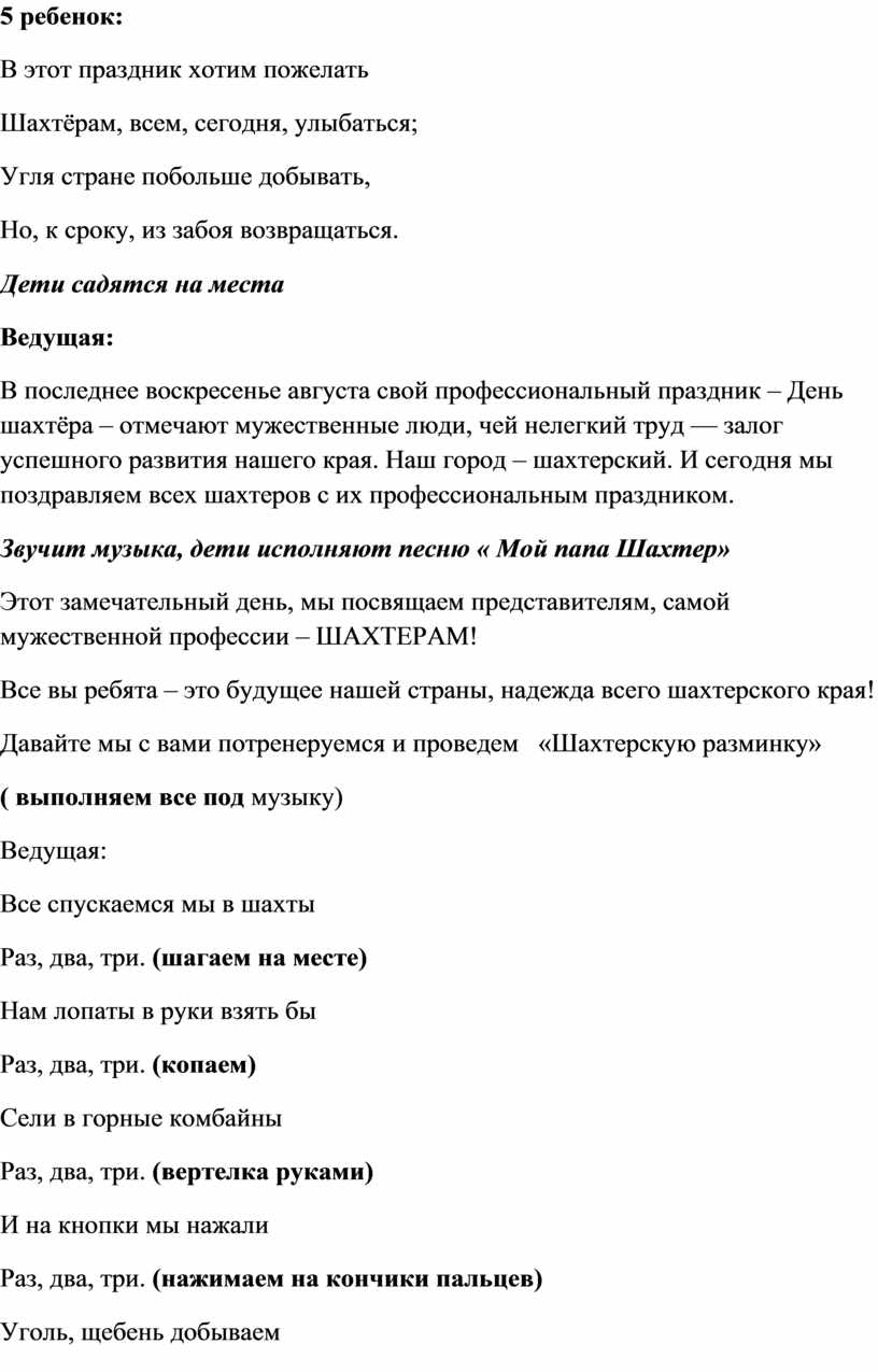 Ведущая: – Добрый день, дорогие ребята! Сегодня мы отмечаем замечательный праздник “День шахтера”! И мы здесь собрались, чтобы сказать много добрых слов о людях которые выбрали для себя сложную, но в тоже время очень нужную профессию « Шахтер»