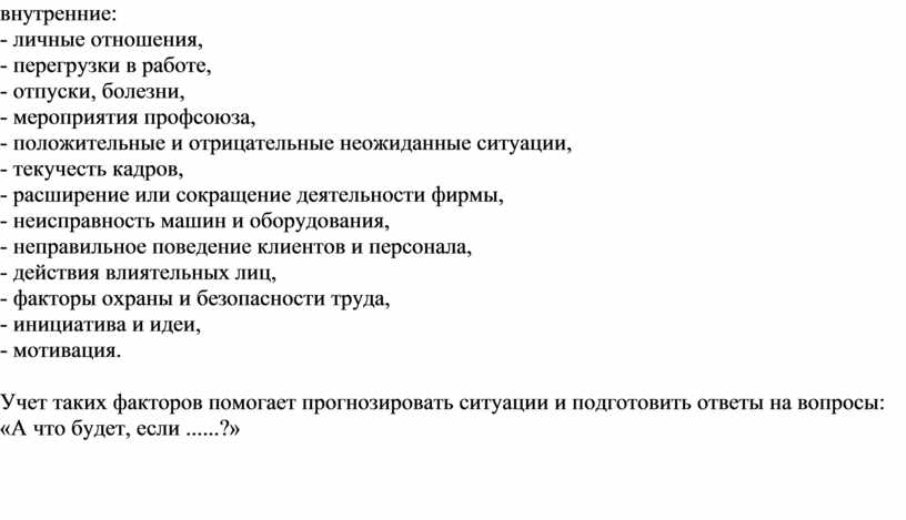 Учет таких факторов помогает прогнозировать ситуации и подготовить ответы на вопросы: «А что будет, если ......?»
