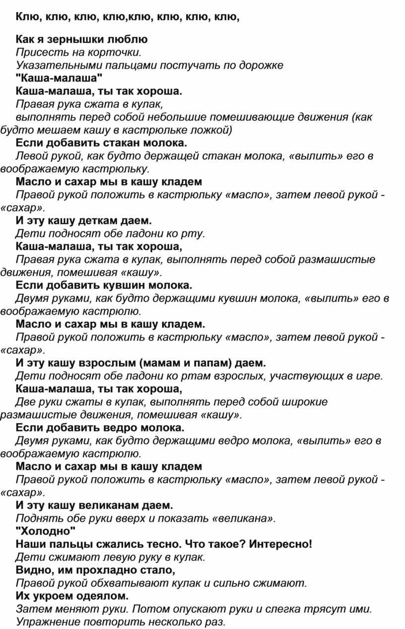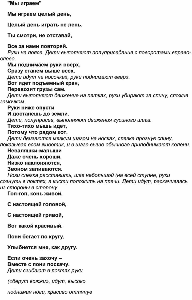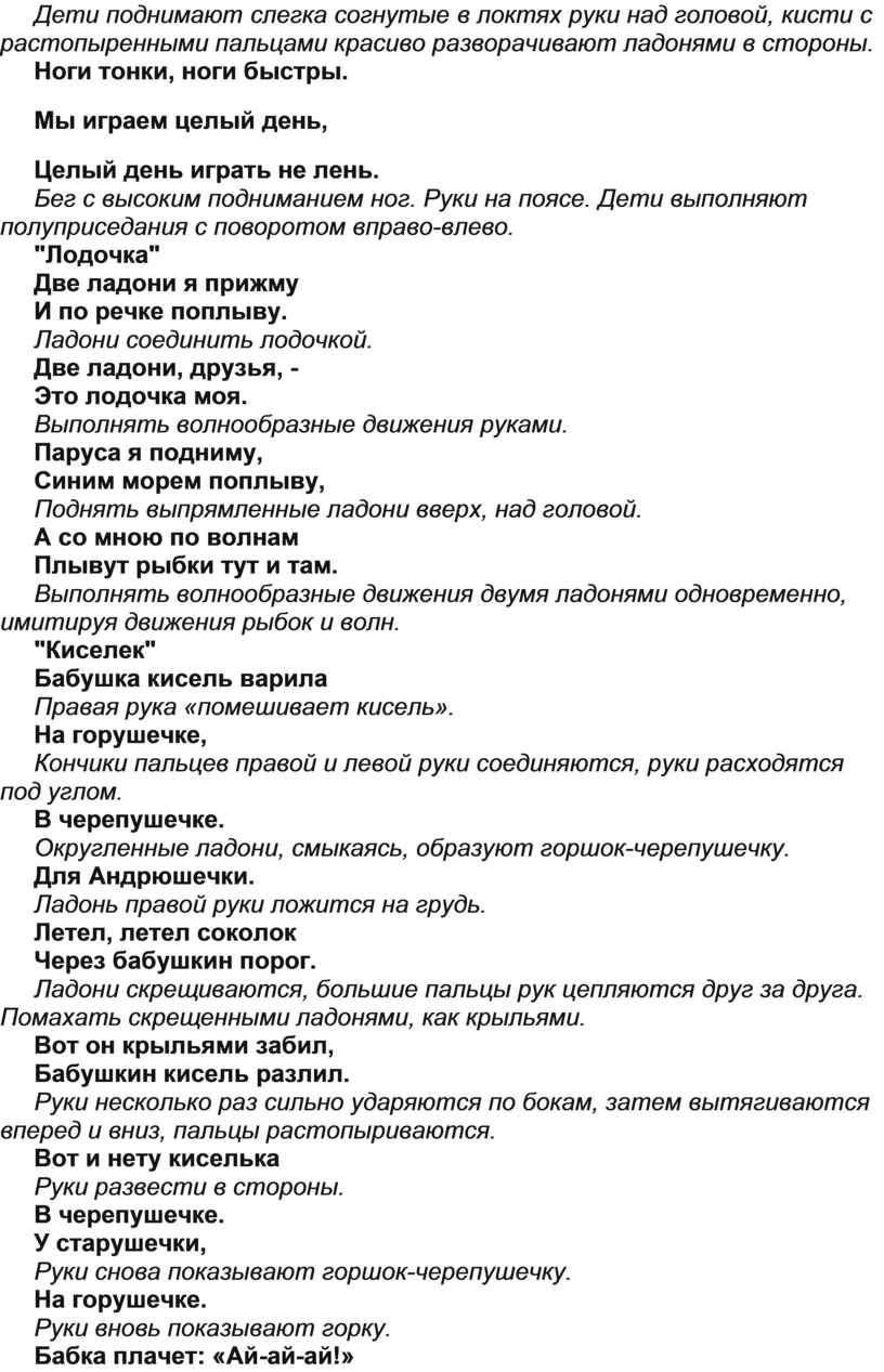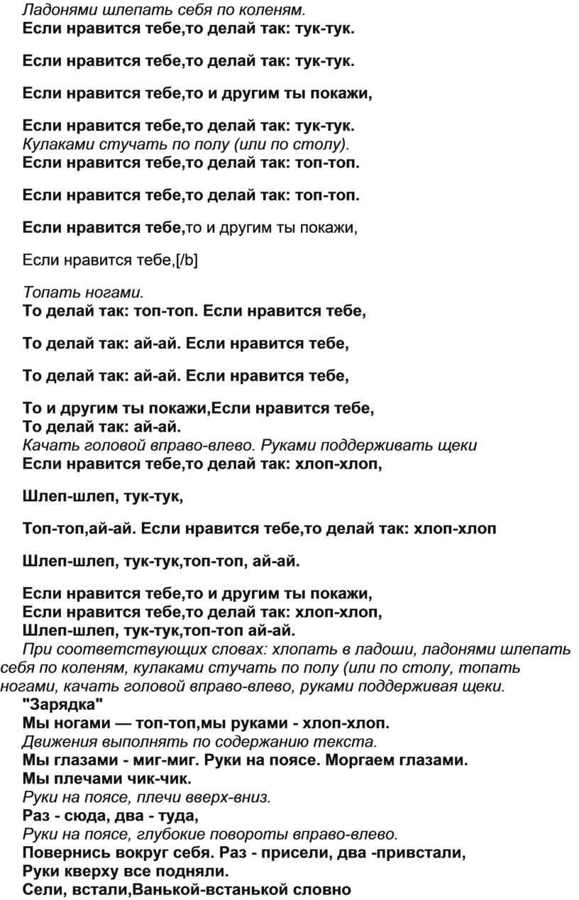 При соответствующих словах: хлопать в ладоши, ладонями шлепать себя по коленям, кулаками стучать по полу (или по столу, топать ногами, качать головой вправо-влево, руками поддерживая щеки.