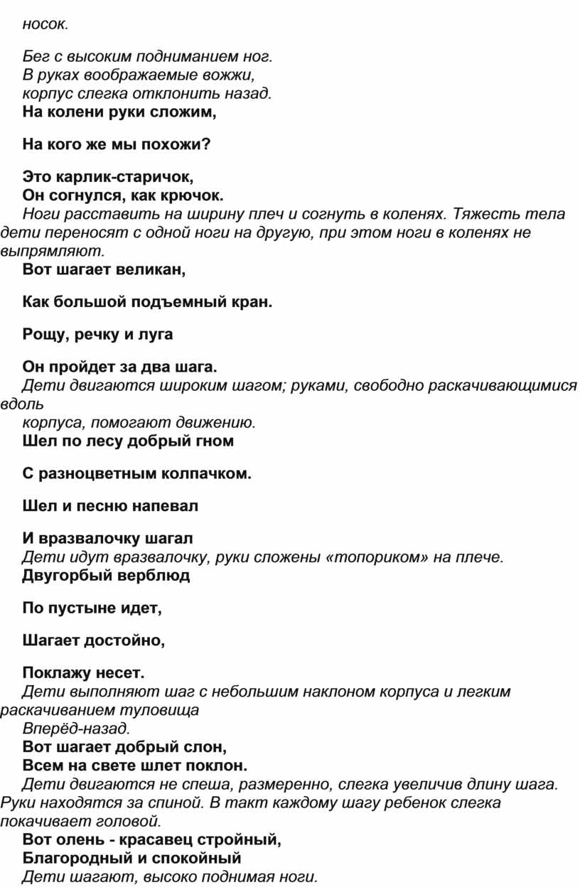 Дети двигаются не спеша, размеренно, слегка увеличив длину шага. Руки находятся за спиной. В такт каждому шагу ребенок слегка покачивает головой.