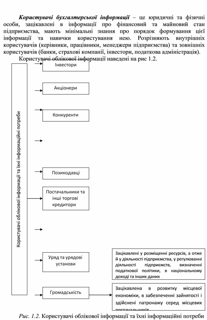 Користувачі бухгалтерської інформації – це юридичні та фізичні особи, зацікавлені в інформації про фінансовий та майновий стан підприємства, мають мінімальні знання про порядок формування цієї інформації та навички користування нею. Розрізняють внутрішніх користувачів (керівники, працівники, менеджери підприємства) та зовнішніх користувачів (банки, страхові компанії, інвестори, податкова адміністрація).
