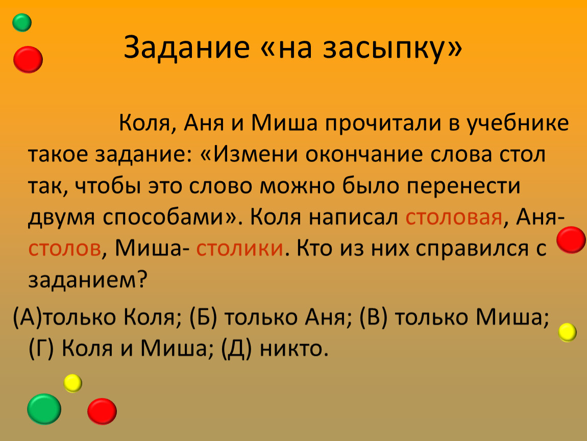 Коля, Аня и Миша прочитали в учебнике такое задание: «Измени окончание слова стол так, чтобы это слово можно было перенести двумя способами». Коля написал столовая, Аня-столов, Миша- столики. Кто из них справился с заданием?