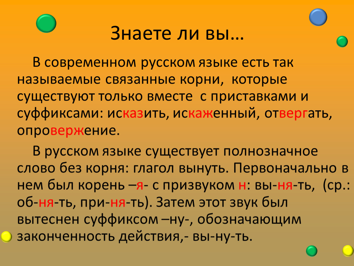 В современном русском языке есть так называемые связанные корни, которые существуют только вместе с приставками и суффиксами: исказить, искаженный, отвергать, опровержение.