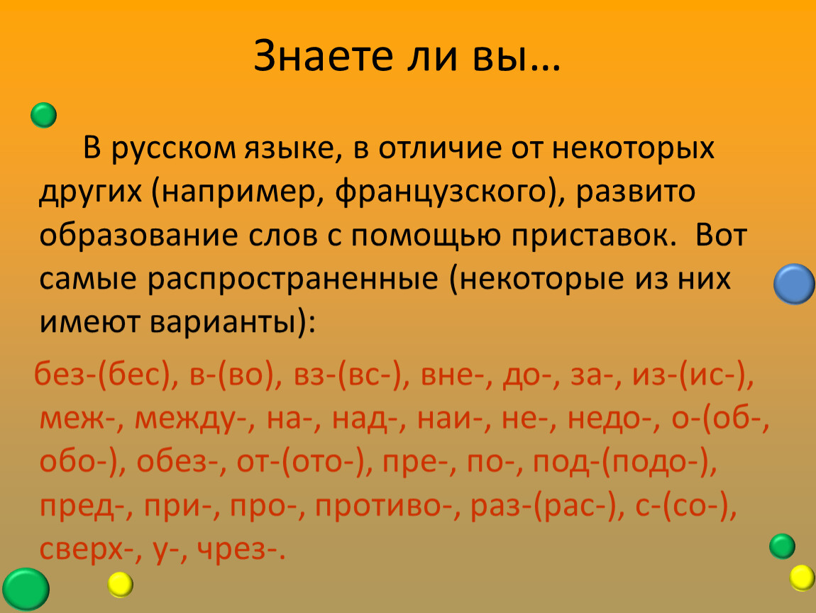 В русском языке, в отличие от некоторых других (например, французского), развито образование слов с помощью приставок. Вот самые распространенные (некоторые из них имеют варианты):
