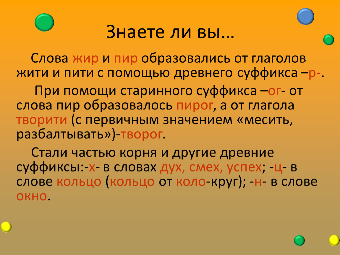 Слова жир и пир образовались от глаголов жити и пити с помощью древнего суффикса –р-.