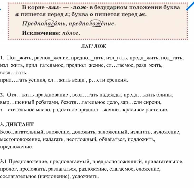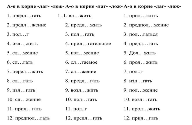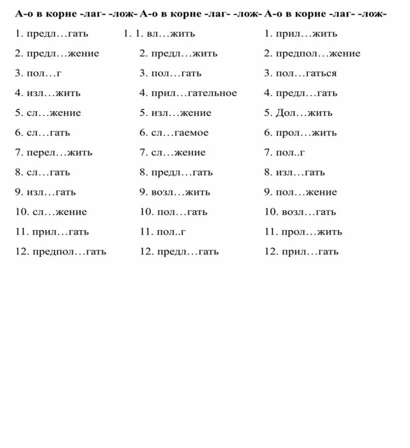 1. Пол_жить, распол_жение, предпол_гать, изл_гать, предл_жить, пол_гать, изл_жить, прил_гательное, предпол_жение, сл…гаемое, разл_жить, возл…гать.