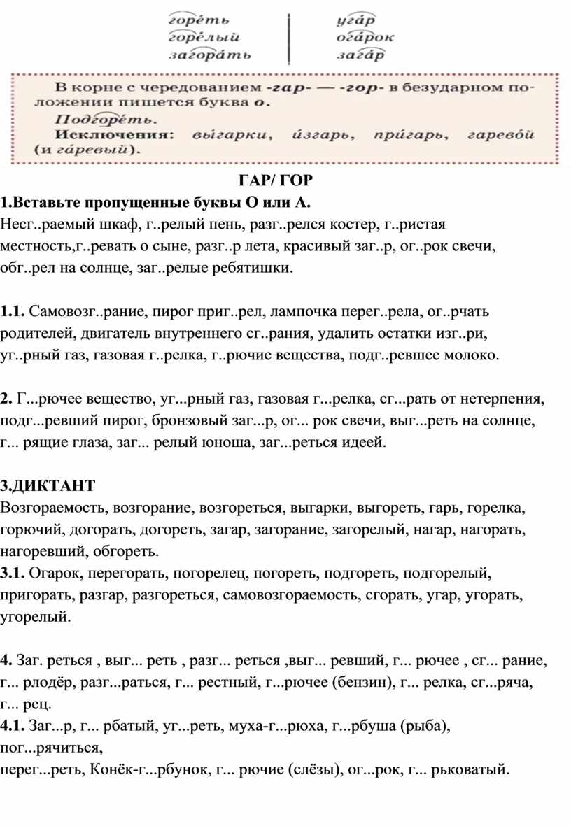Несг..раемый шкаф, г..релый пень, разг..релся костер, г..ристая местность,г..ревать о сыне, разг..р лета, красивый заг..р, ог..рок свечи, обг..рел на солнце, заг..релые ребятишки.