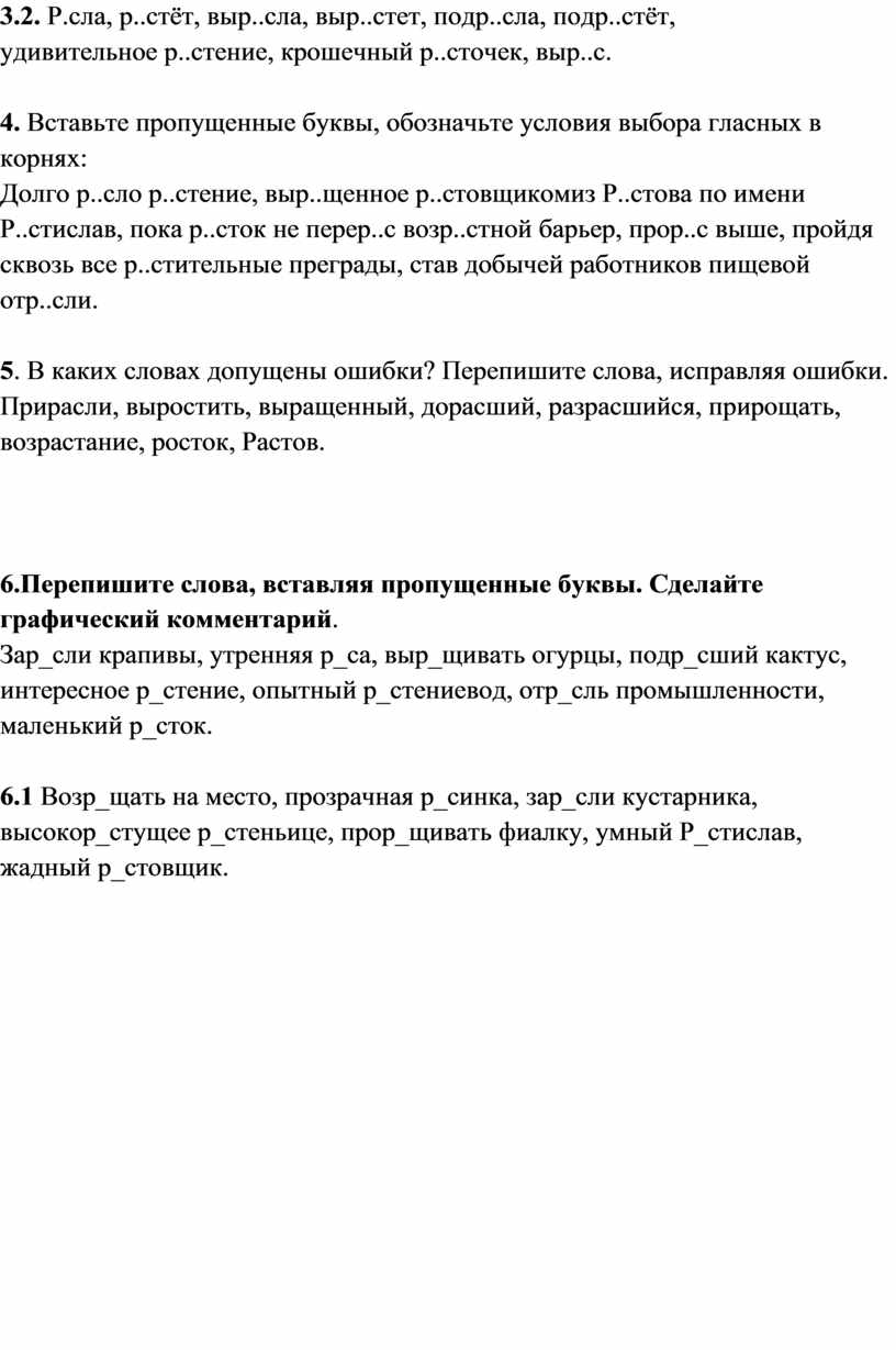 6.1 Возр_щать на место, прозрачная р_синка, зар_сли кустарника, высокор_стущее р_стеньице, прор_щивать фиалку, умный Р_стислав, жадный р_стовщик.