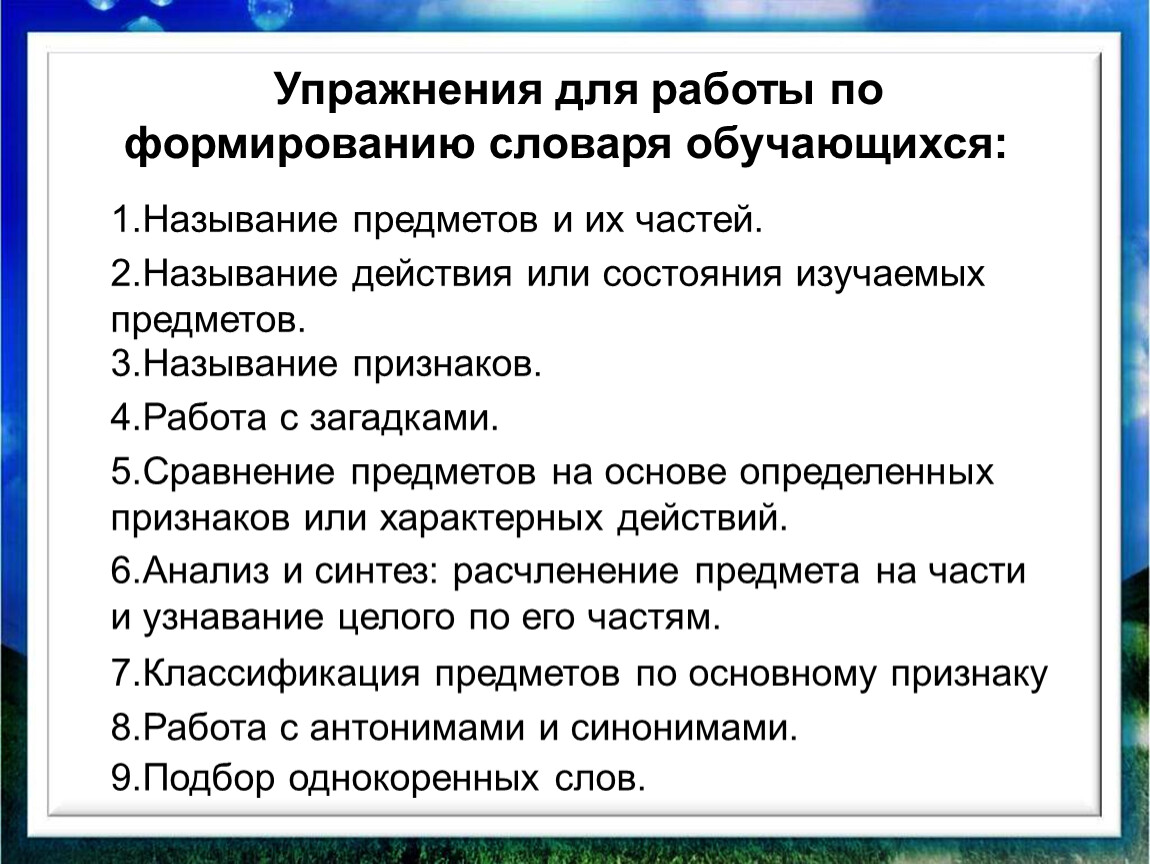 уточнение словарного запаса (расширение понимания значения слов, наполнение содержанием слов, имеющихся в словаре, усвоением